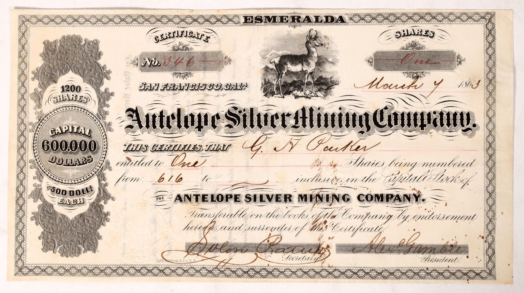 Antelope Silver Mining Company, incorporated in California around 1861, located in Esmeralda Mining District. Certificate no. 346 issued to Geo H. Parker for 1 share at $500 each on Mar 7, 1863 in San Francisco. Singed by president Alex Gamble and secretary Solon Pateco(?). Signed by Parker on reverse, not cancelled.