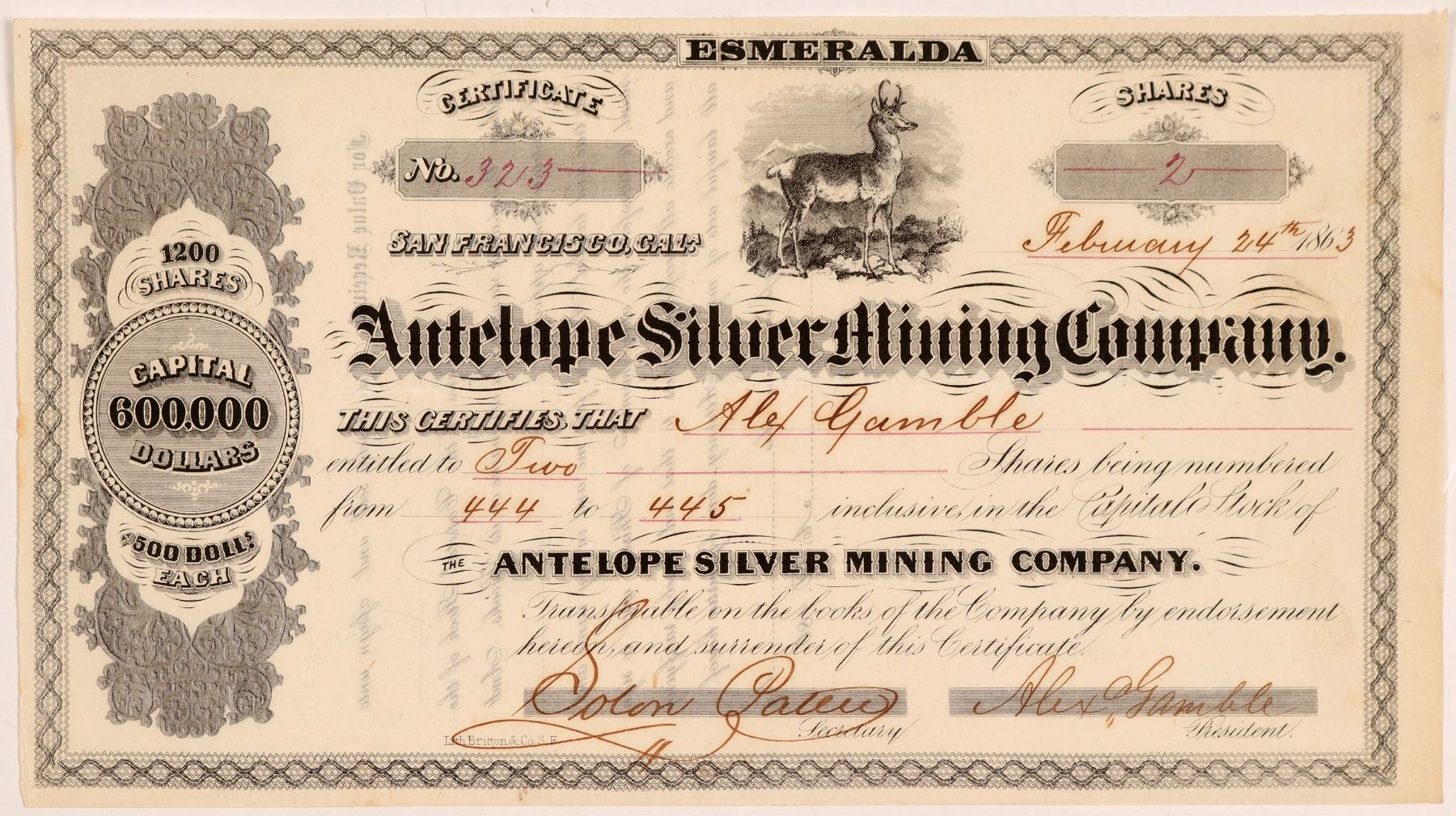 No. 3213 for two shares to Alf Gamble. Share numbers 444 to 445. Signed by Solan Pateco and president Alex Gamble. Dateline San Francisco 1863. According to the Sacramento Daily Union an Antelope Silver Mining Company of San Francisco with the same $600,000 capital stock. This would actually put this stock certificate in the Utah Territory! Antelope vignette. Britton & Co. printer. Mark Twain in a letter of May 4, 1862 writes his brother, "Yesterday we took a spirit level and got the angle of the celebrated “Antelope” ledge, and tomorrow we shall commence a hunt after the second E. extension of it. We may find it and we may not. The thing has often been tried before, but with no success. If we find it, our fortunes are made - if we don’t, - they ain’t. I have 75 feet in a spur of the “Antelope,” which promises nothing save that it is an offshoot from a good family - and I am aristocrat enough to attach some importance to that sort of thing." On May 5 he writes, "Hunted for “Antelope” today, and found a ledge - but hardly think it is the right one. Four of us boys have dug two trenches, each 20 feet long and 6 feet deep, to-day, in the gravelly hill side. Finally, if we do find the “Antelope,” we shan’t care a d—n any more." [Letters from the Mark Twain Project]