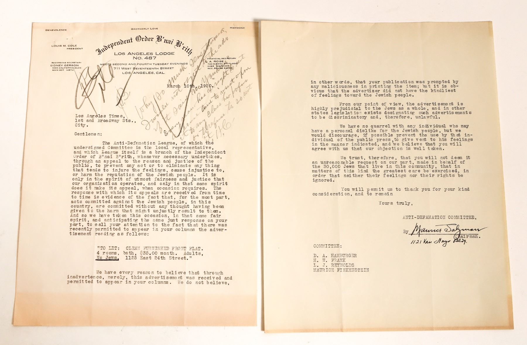 A letter from the Los Angeles branch of the Anti-Defamation League to the Los Angeles Times, dated March 10th, 1920. The letter discusses an ad for a flat that had recently been run in the Times with the line 'No Jews'. The letter is written and signed by the chairman of the ADL, who describes this ad as prejudicial and requests that the Times handle such matters more thoughtfully in the future. There is a handwritten pencil note on the letter, likely from someone at the Times, claiming there was no issue with the ad. An interesting piece of American Jewish history. The letter is typewritten and in good condition.