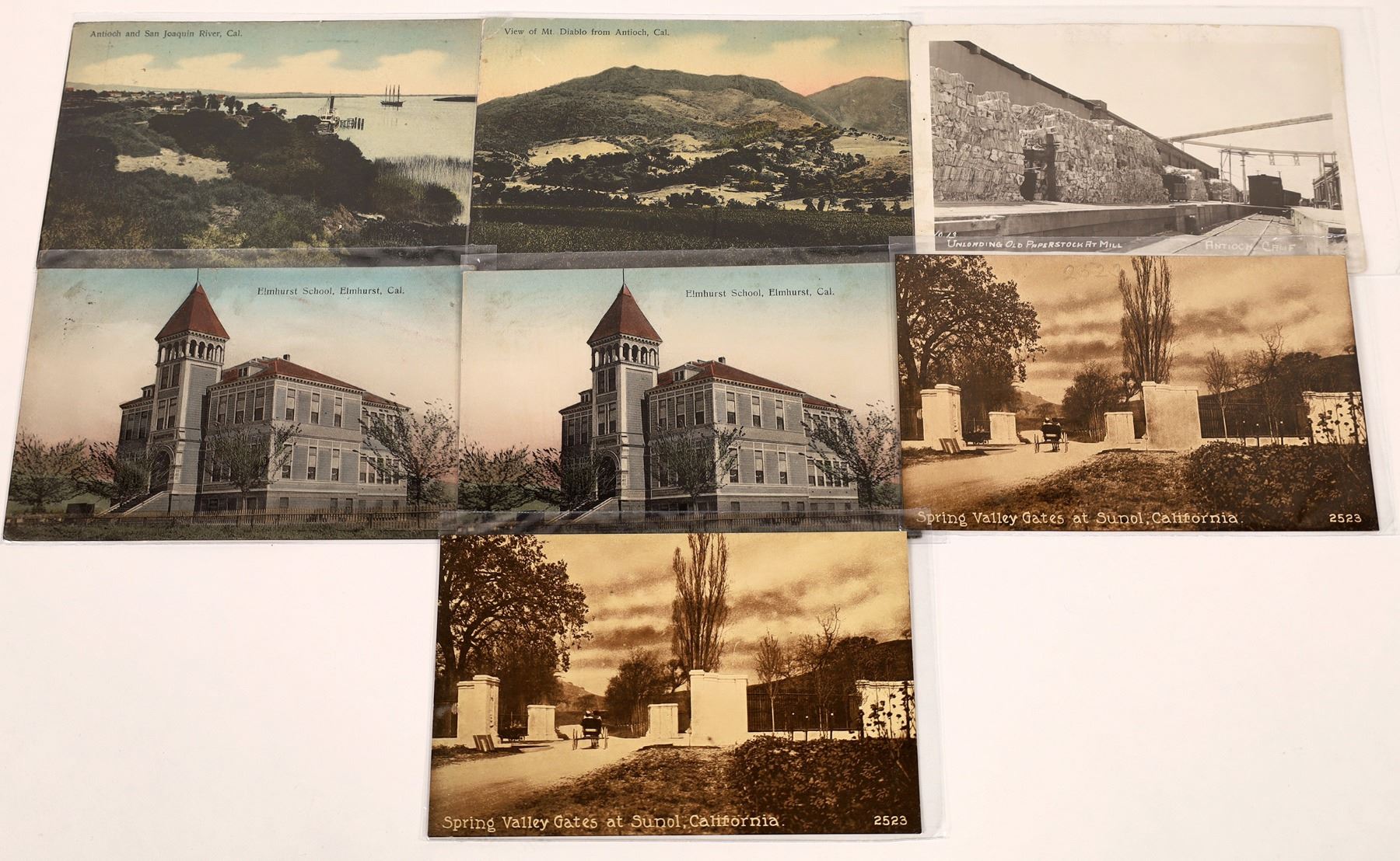 Lot of seven early postcards: three from Antioch; two of the Spring Valley Gates at Sunol; two of Elmhurst School, Elmhurst.