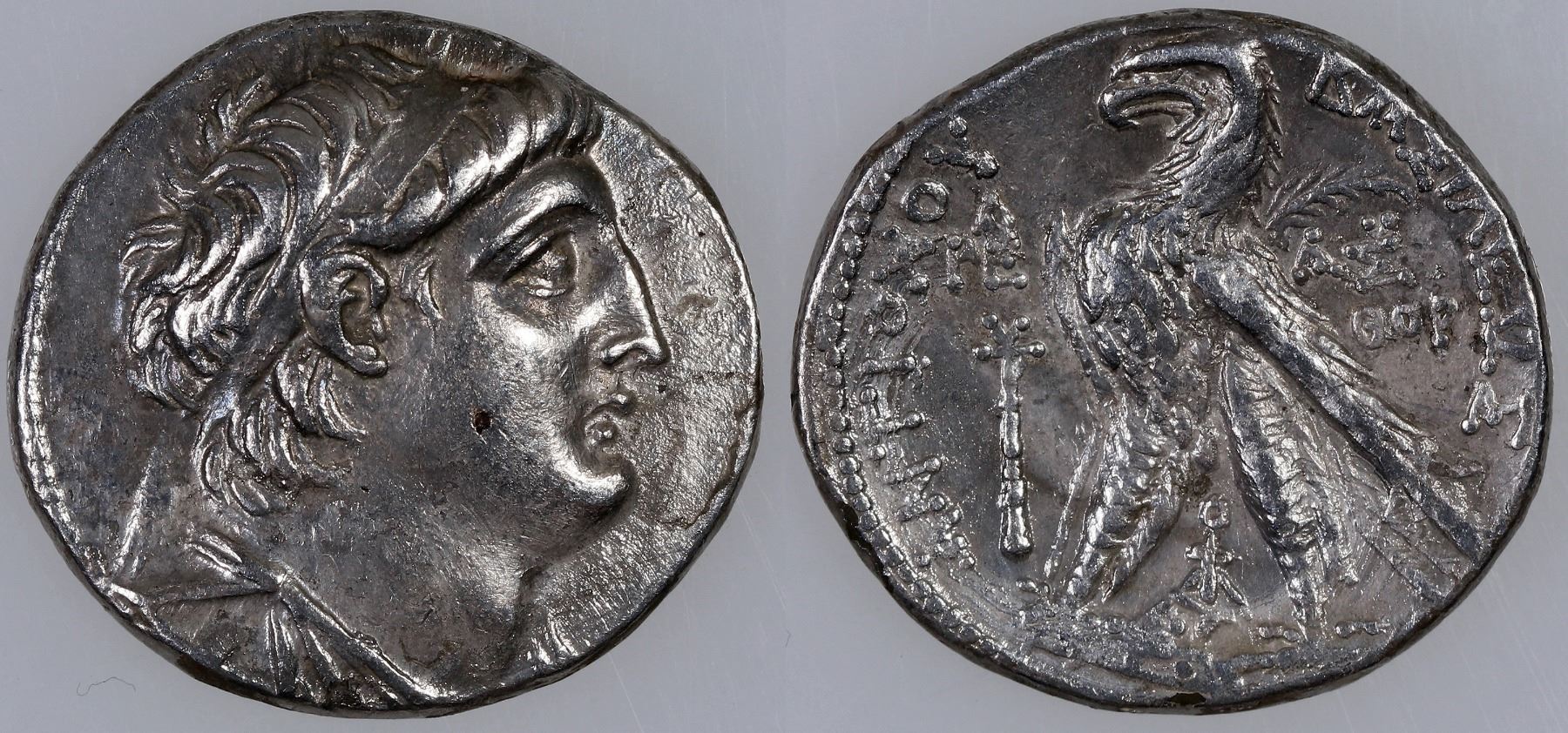 Antiochus VII Euergetes, nicknamed Sidetes (from Side), ruler of the Hellenistic (Greek) Seleucid Empire, reigned from 138 to 129 BC. He was the last Seleucid king of any stature. His coins featured his profile and various Greek gods. This tetradrachm from Tyre is very fine, with eagle reverse. 12.81 gr.,, 28 mm.