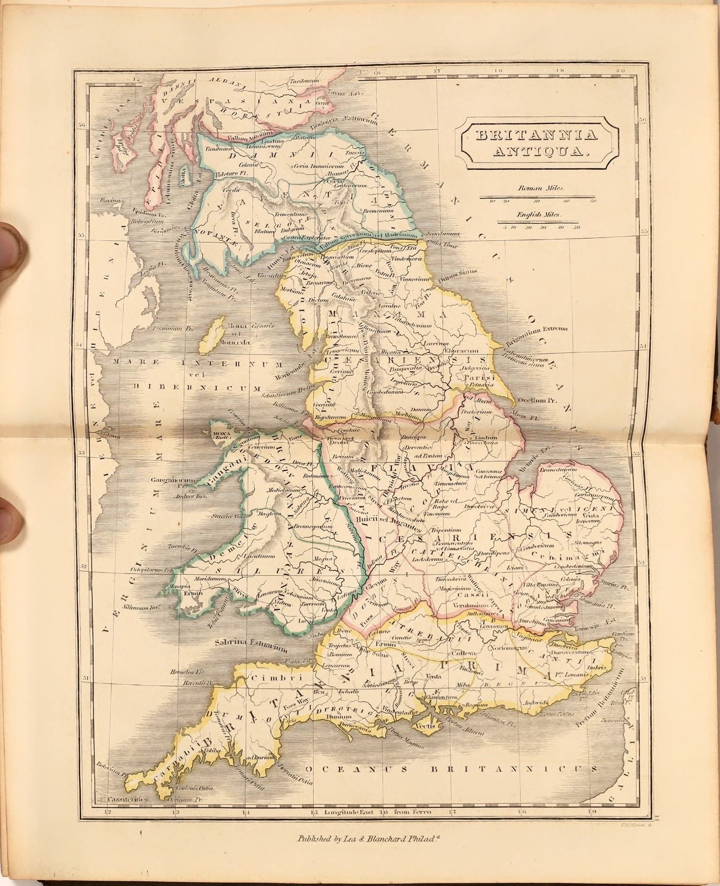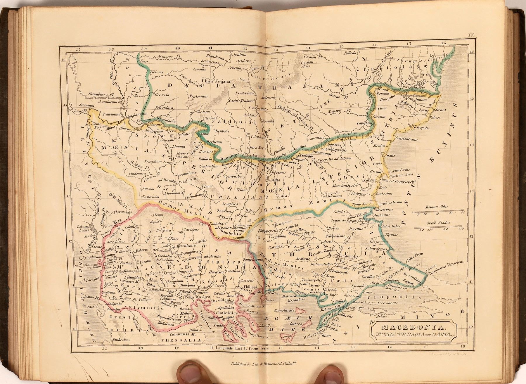 Hard cover book titled Dr. Butler's Atlas of Ancient Geography. By Samuel Butler, D.D., published by Blanchard and Lea, Philadelphia. 1851. Includes 20 color maps of ancient Europe, Middle East, Orient, North Africa. Includes index of latitudes and longitudes of locations within each map plate. Gray covers with burgundy colored spine. Spine mostly worn away but binding still intact. Damage to lower corners of covers. State: City: Date: Provenance: