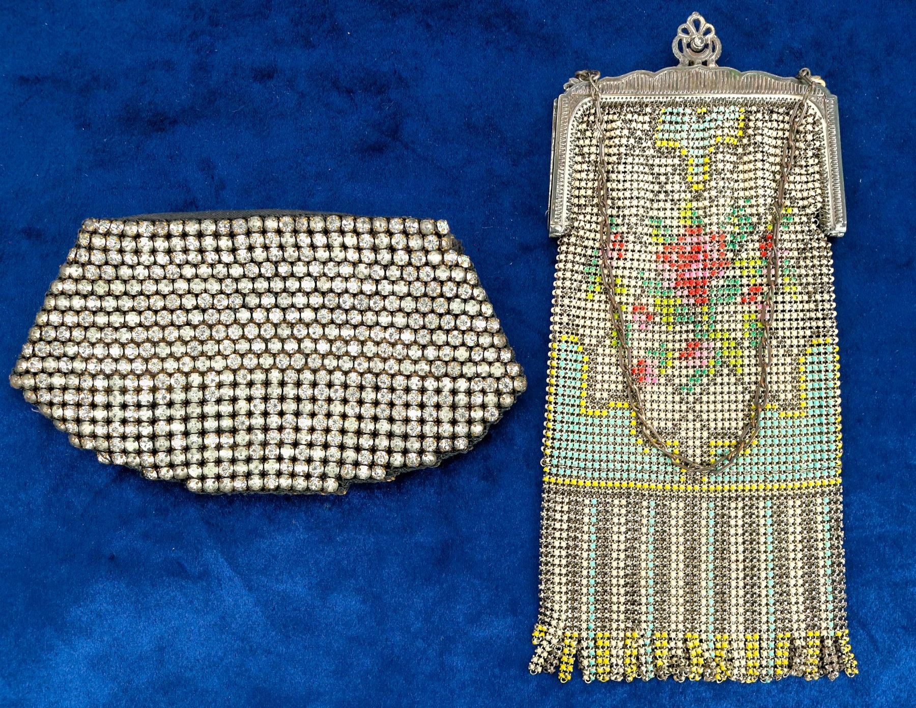 A pair of choice antique beaded purses, c. 1880-1920. Includes one small zippered clutch with rhinestone beading and silk lining, and one beaded chain bag with a metal closure + chain and colorful floral design. The chain bag has a small hole and some wear at the joints of the metal closure; see photos.