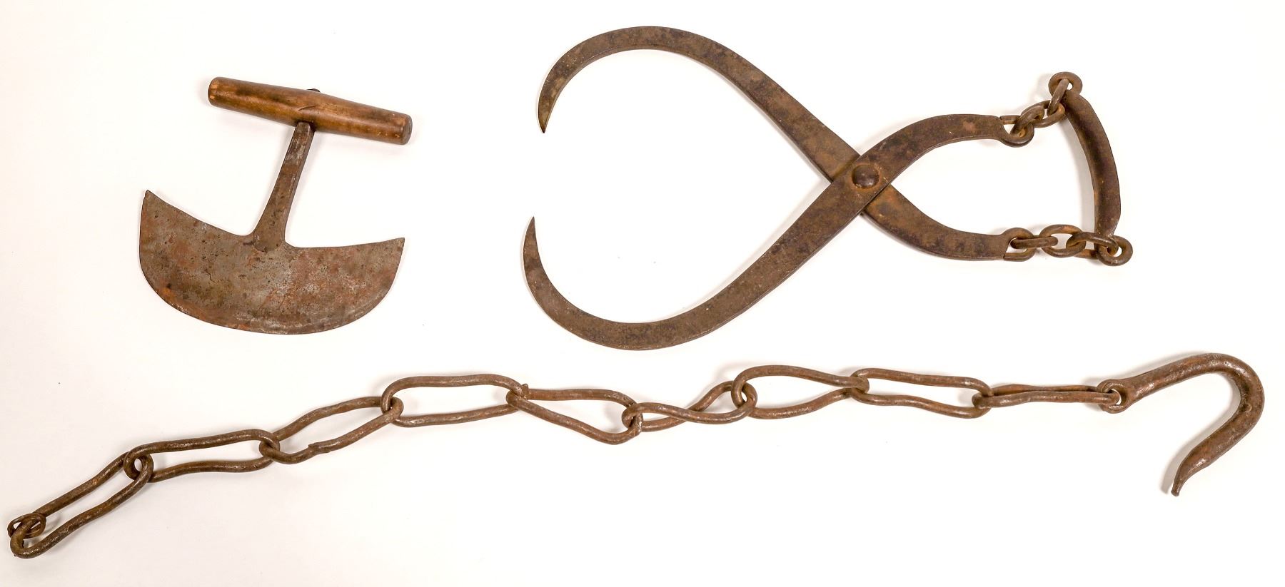 Lot of 3 pieces. 1) Handmade chain with hook, 30" long. 2) Ice tongs, 15". 3) Hand tool with sharp crescent blade, wood handle. 6.5 x 7"