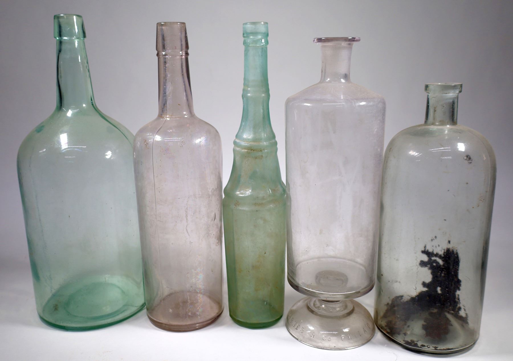 5 Large Antique Bottles, Large Aqua Carboy about 2 gallon, tooled top, large tooled top light purple whiskey, about 18" tall, 2 large clear medical bottles and 18" tall applied top aqua Champion's Vinegar with stain.