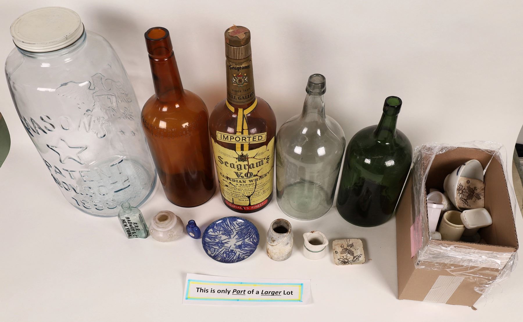 Large group of antique bottles. About 22 milk glass; 4 giant bottles; 3 Mason Jars (incl Whitney); RRR open pontil (a beauty, heavy whittle); about 30 low-end misc.; and 8 California drug bottles: includes: Colton (chip), Pomona, SF, Stockton, Southern Pacific Hospital.; Bartlett Mineral Springs (appears near mint).