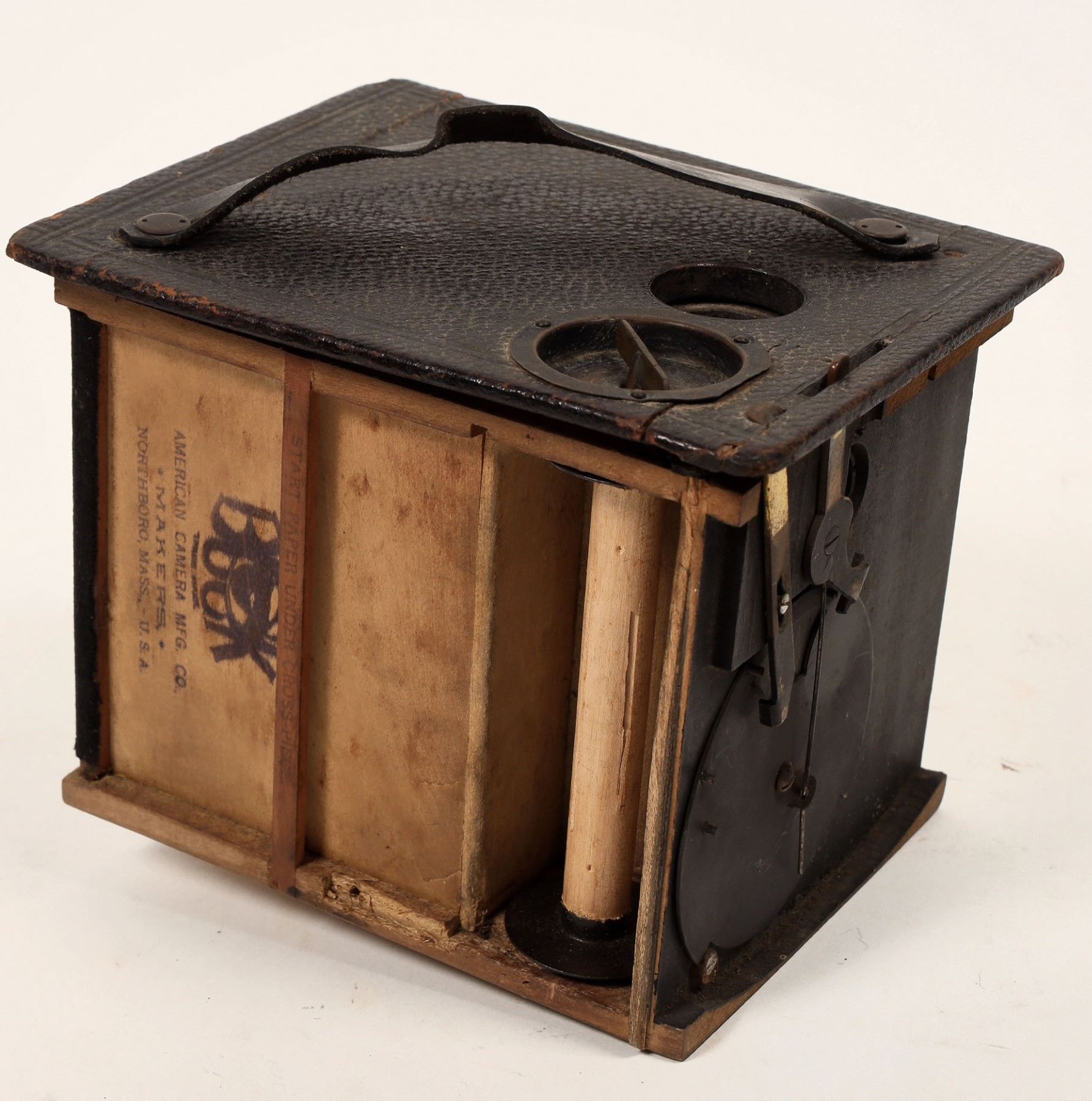 Early box-type camera, circa 1900, made by American Camera Mfg. Co. of Northboro, Massachusetts. Wood construction, with film roller, lens and slide adjustable shutter. Black vinyl wrapped exterior surfaces, leather handle strap on front. Measures approx. 4.5" x 5.75". In fair condition, some tears and wear on the outside fabric coverings. Knobs, slide controls move but not precise. Box closure loose, not a tight fit when slid into outer case. Other piece is what appears to be a wooden cased early Ford ignition coil unit. Case is heavy, with contacts and an adjustable contact lever dominating the top. Measures approx. 6" high, 3.3" wide and 2" deep. "Ford" is carved in script on the top flange of this T & G case. Both pieces are in fair overall condition. The Ford piece is likely a 'buzz coil' for a Model T, a rare find. Please see photos.