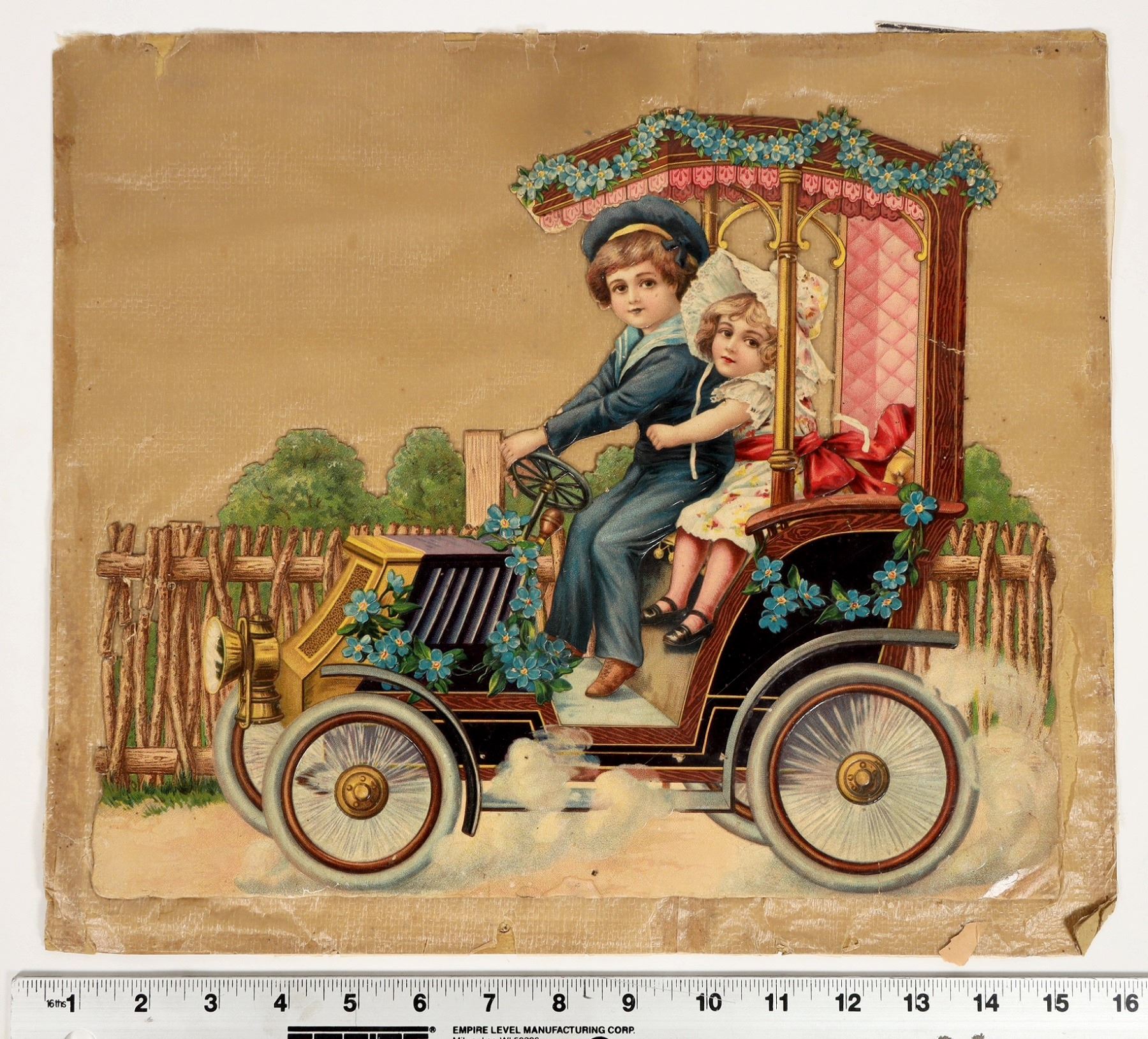 Diecut of an antique car with a boy and girl. 11.5x14". Mounted on a thick paper backing.