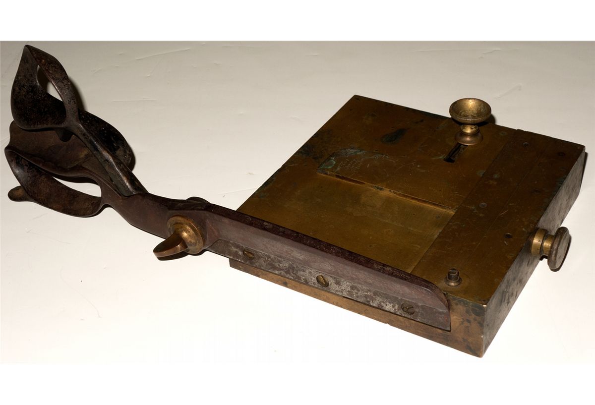 Brass card trimmer 6 x 6" with shear attached. Trimmer's used by card cheats did not have markings, but this one was made at Mason and Co. Chicago. Cards can be trimmed for neatening new edges, magician card tricks, as well as for immoral purposes.
