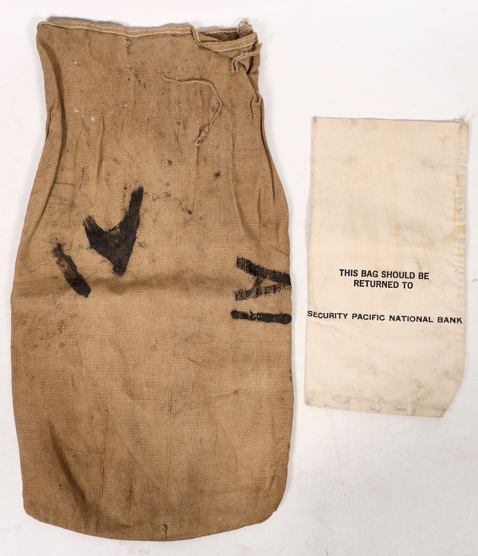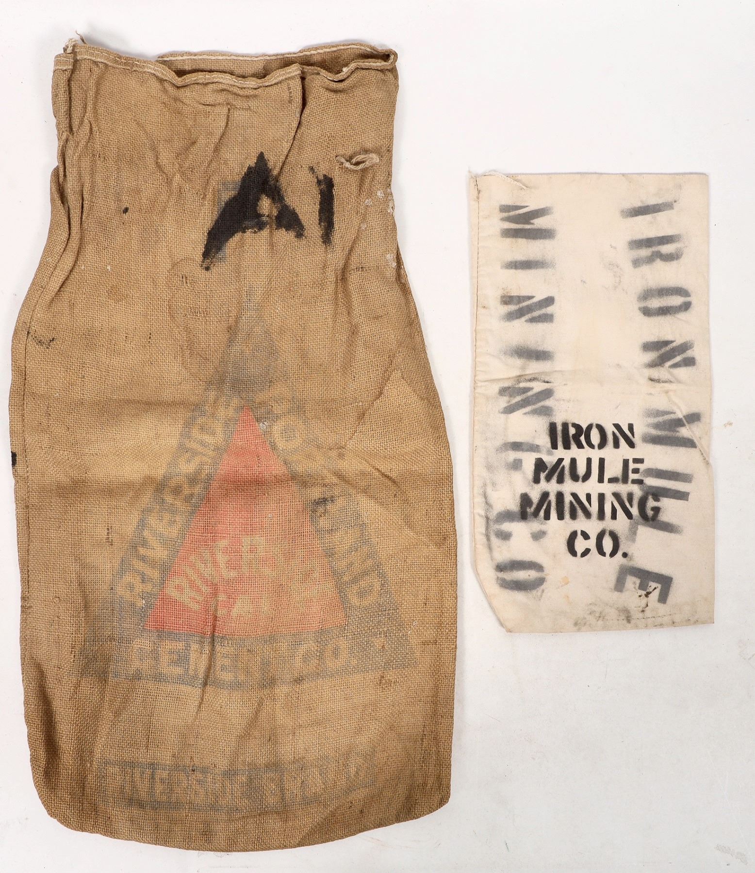 A pair of antique bags, likely dating c.1910s-1930s, from the Iron Mule Mining Company and Riverside Portland Cement Company. Date is estimated based on the establishment of Riverside Portland Cement, which occurred in 1915. The Iron Mule bag is made of canvas, with 'IRON/MULE/MINING/CO.' on the front and a note requesting the bag be returned to Security Pacific National Bank on the back. The Riverside bag is a coarse-woven bag with a faded triangular logo bearing the company name on the front.