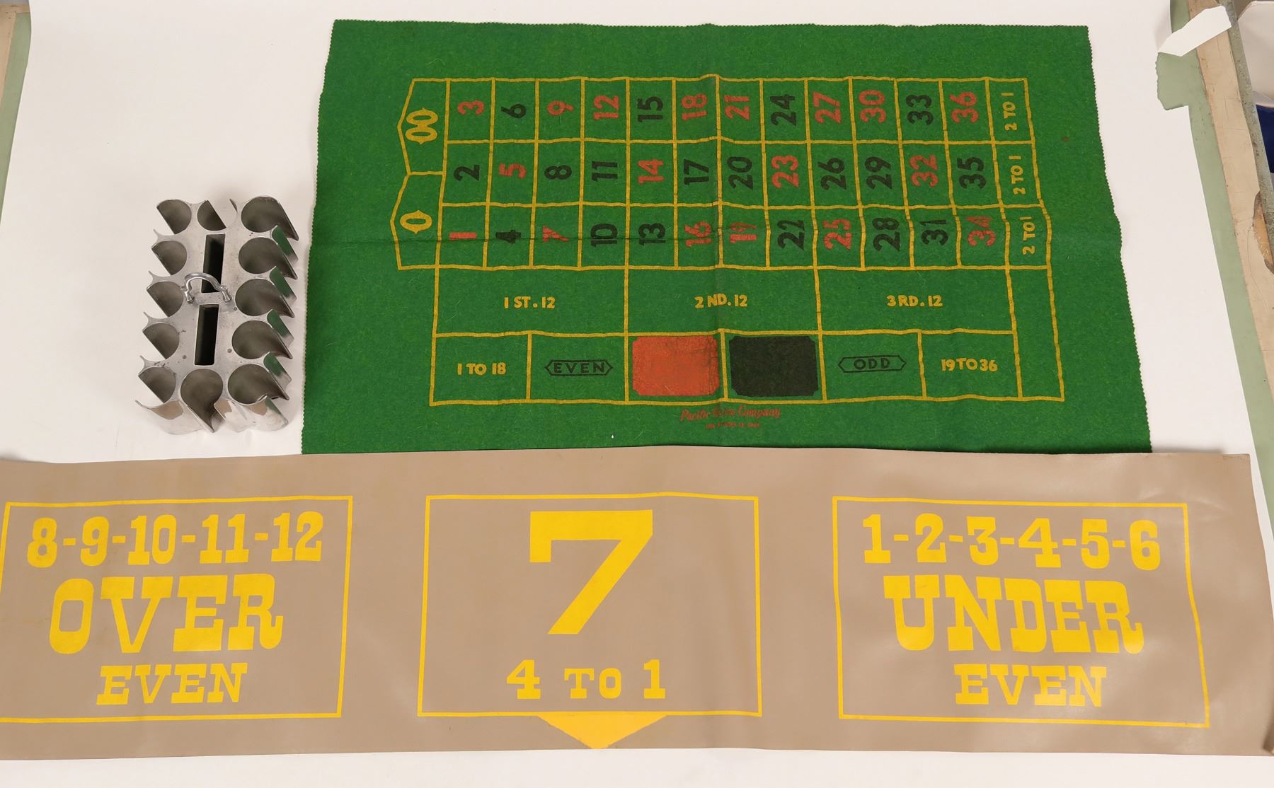 An antique metal gaming chip tray and a gaming felt. and an oil cloth gaming piece. Green felt measures 36"x 24", while oil cloth measures 48"x 12". All are in good condition. See photos for more details.