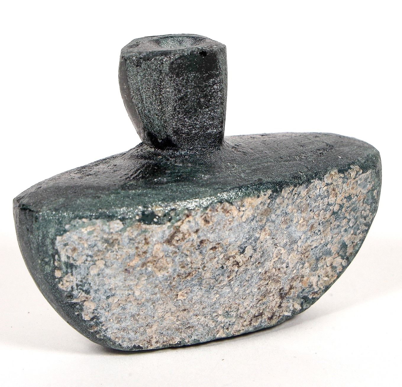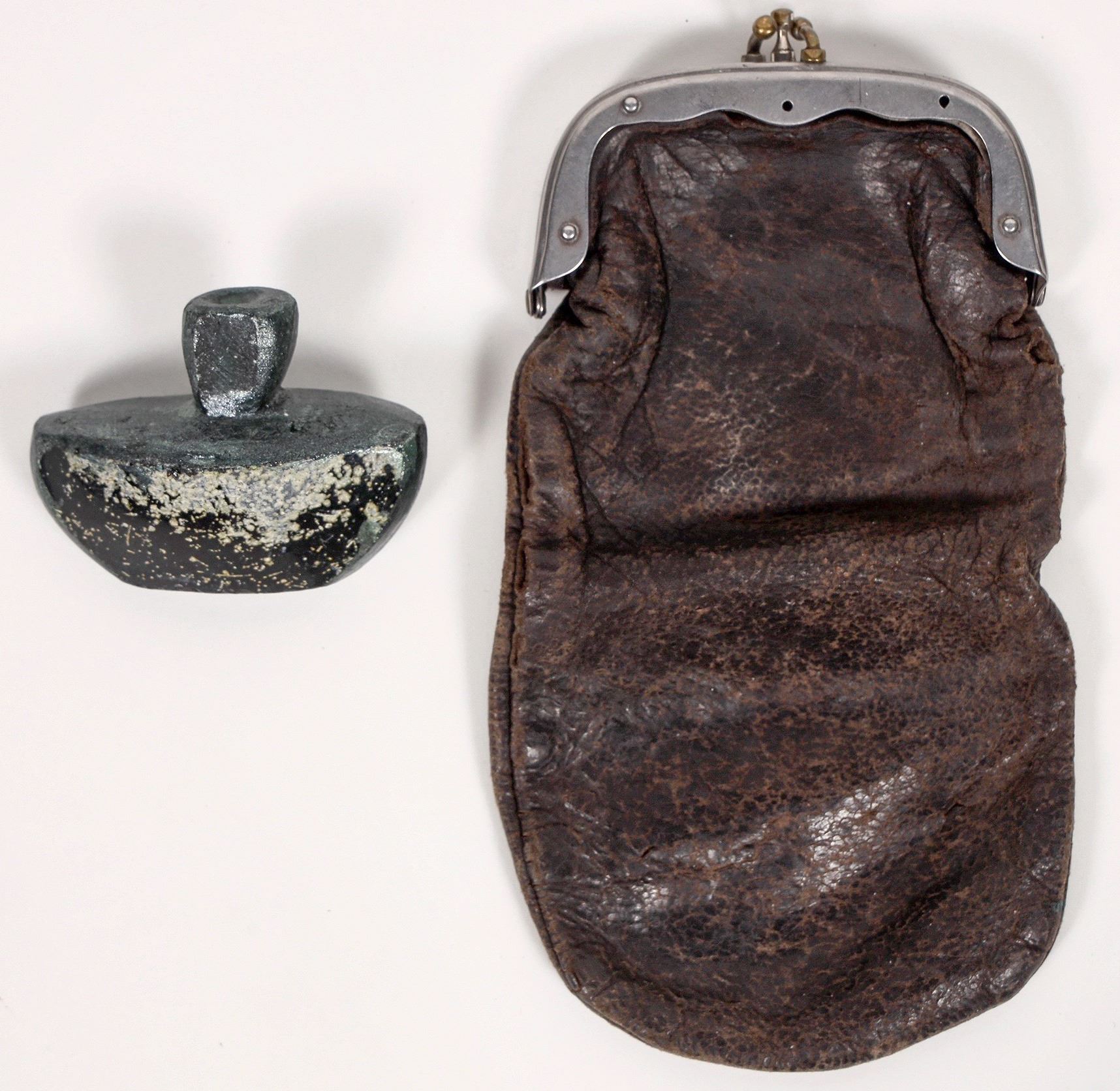 Brown leather antique coin purse; six inches long, with two compartments. Also, a piece of primitive money, we believe to be a modern reproduction. 56.21 grams; 2 1/2 inches wide, 2 inches tall. Could be an oil lamp.