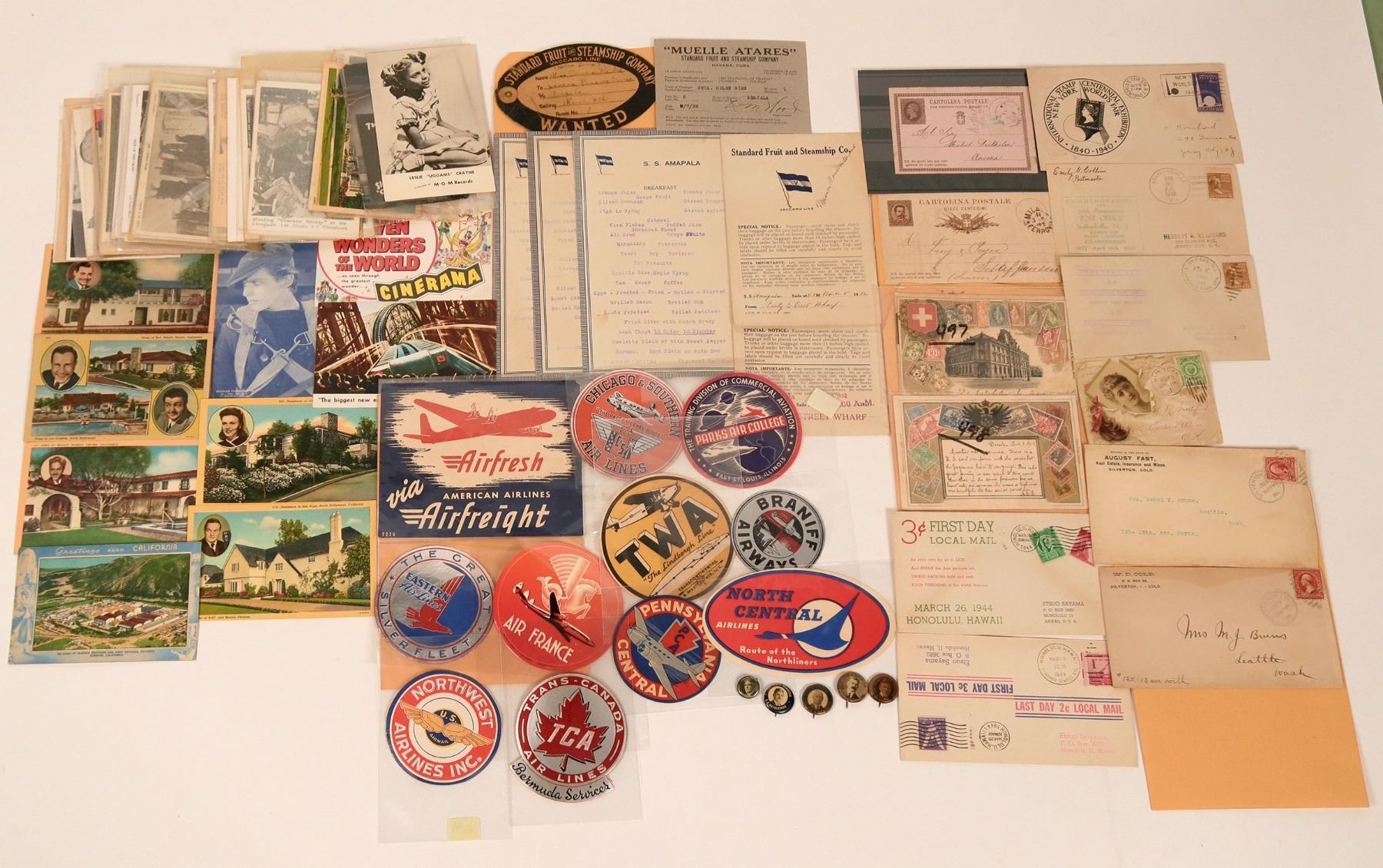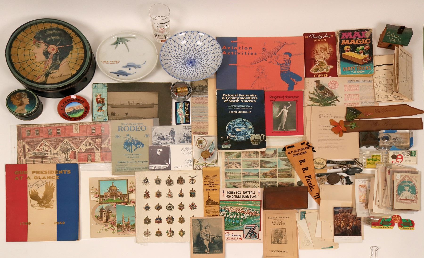 This lot is one of those "end of the day" assortments, where the items may not have fit in other lots, or it came out of boxes late in the game. That makes for a perfect "dealer" lot! Collectible tins, souvenir plates, pins, post cards, flag, documents from around the US, and much more. Please see the photo online.