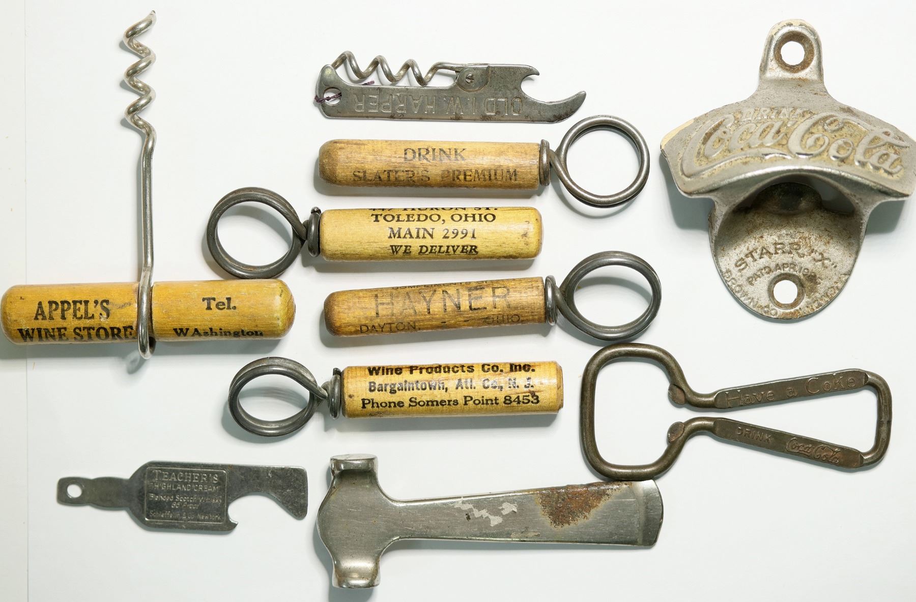 Lot of ten old devices: Appel's Wine Store of Amsterdam Avenue New York corkscrew; Old I. W. Harper corkscrew/bottle opener; bottle openers from Coca Cola, Teachers Highland Cream, Egg Harbor Wine Products, Herman Krauss Fine Wines, Hayner, Slater's Premium Whiskey. Wall mount Coca Cola opener, cigar box opener from New York.