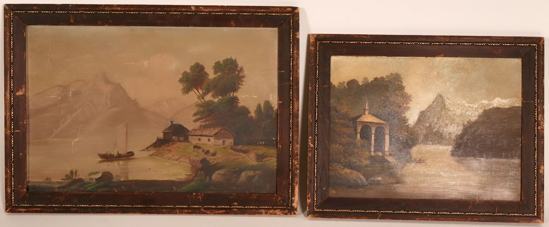 Antique oil on cardboard landscape paintings. Both appear to have been painted by the same person, unsigned. 1) Houses on edge of lake, mountains in background, sailboat in water dark coloring. Painting has some surface scratches. Original frame: 15" x 21". 2) Boat on lake by unusual building, mountains in background. Original frame: 13.25" x 16.75". Both have a European feel to them. Please inspect.