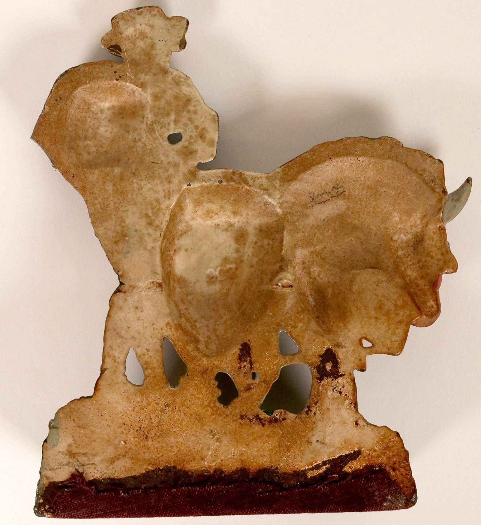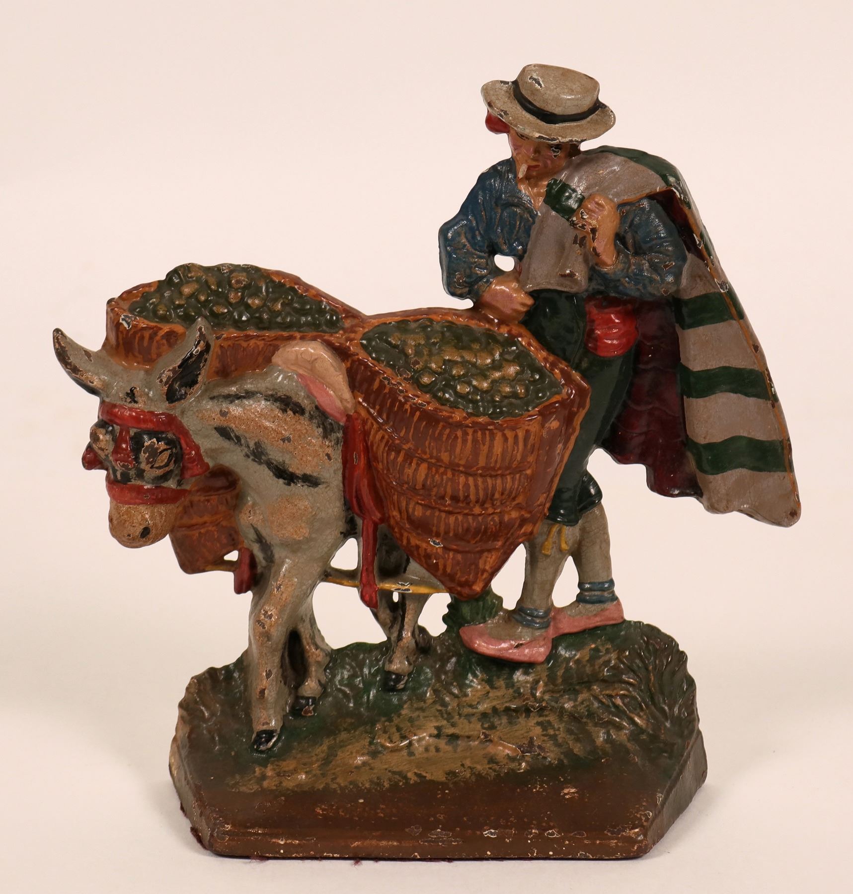 Doorstop in apparent Mexico design, colorful, no maker. 8" across, 8" tall. Minor paint chips. The number 207 is punched into the back center. Possibly circa 1930s.