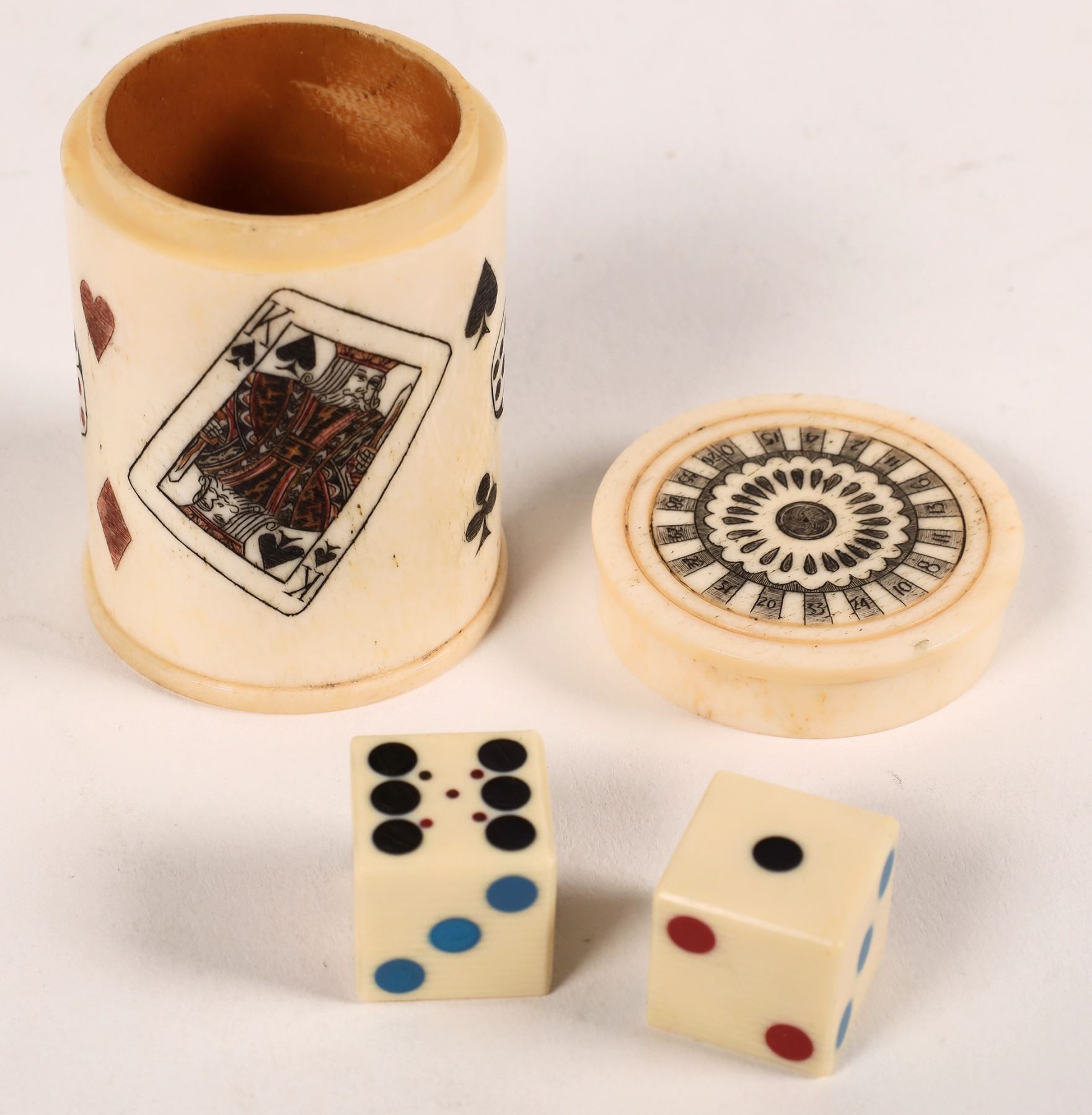 Antique dice gaming cup with a pair of dice. c. 1900-1910. This has been hot pin tested for antique ivory or bone and is not plastic based. The cup and top have been hand engraved and colored with a very nice patina. The cup measures approximately 2 x 1.50 inches. There is a very intricate roulette design on the top. The dice are approximately .5 x .5 inches and are hand engraved with different colors (red, black, blue). This would probably have been used as a bar dice game and would make a great addition to your gaming collection!