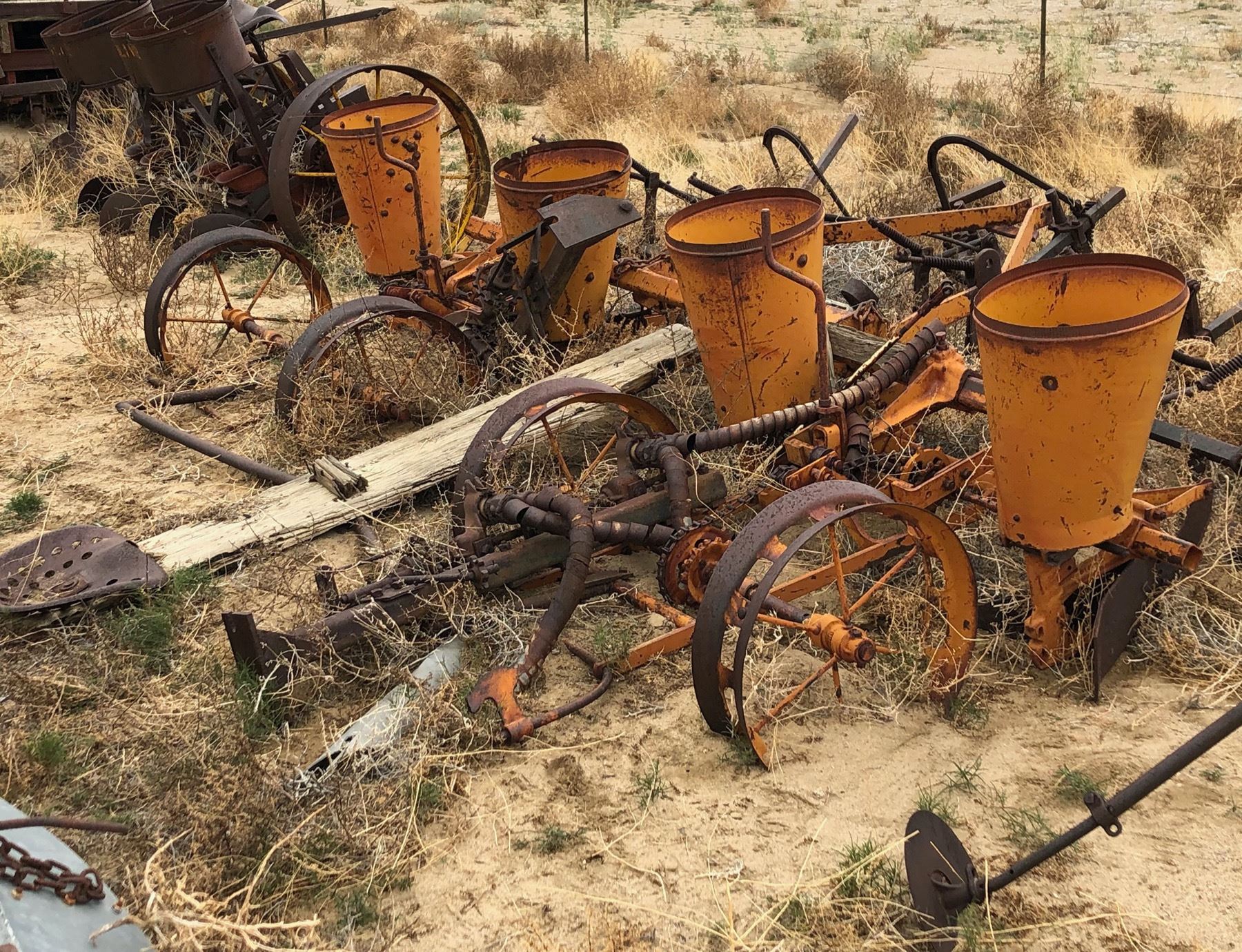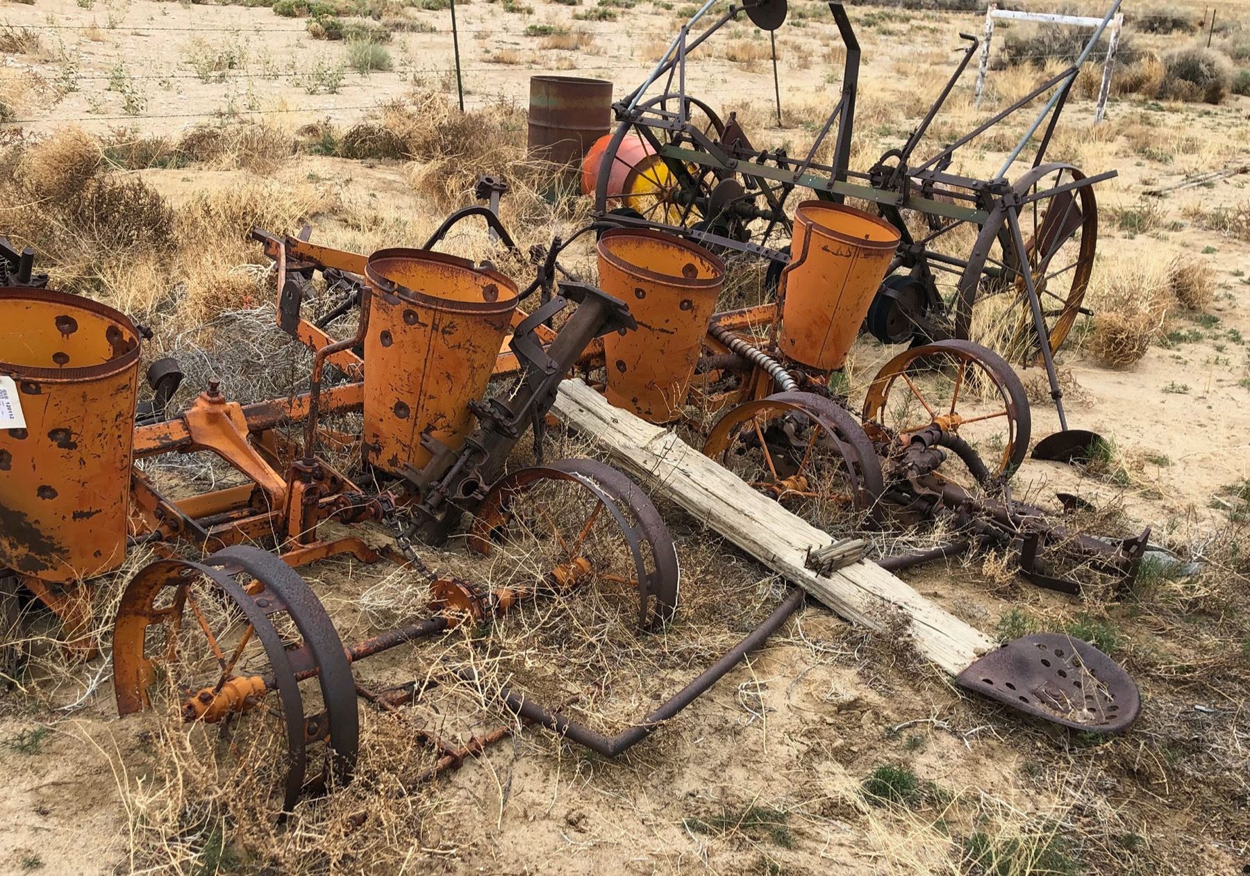 10' wide, 4 seed buckets, trailer pulled antique field seeding machine. tractor seat mounted on wood plank at center. great farm antique. (FOB Fish Lake Valley, Nevada)