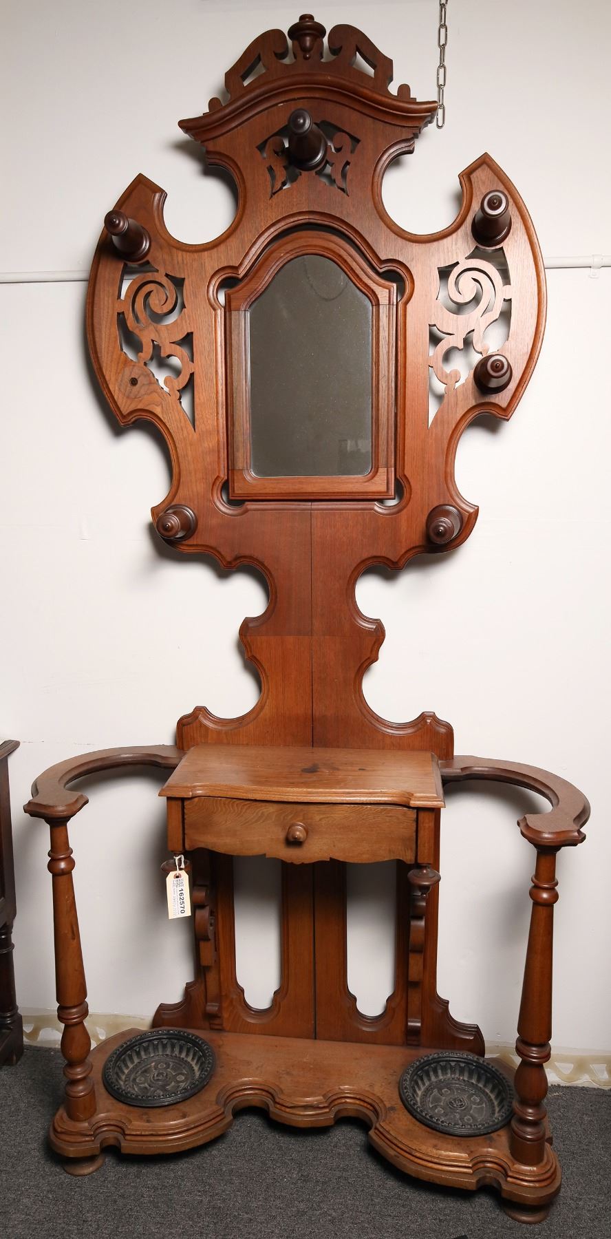 Solid wood, antique coat tree or hall tree. Decoratively carved. Not too heavy, probably walnut. Unique design. Stands approximately 7 feet tall, 3.5 feet wide and 1.5 feet deep. Thick, framed, antique mirror in perfect condition, six coat hooks, center drawer and side arms that create two locations for umbrellas, canes, with removable, ornate cast iron drip saucers below. Beautiful piece. Well made; drawer corners are dowelled. One missing coat/hat hook on left side. Buyer must arrange for pickup or shipping.