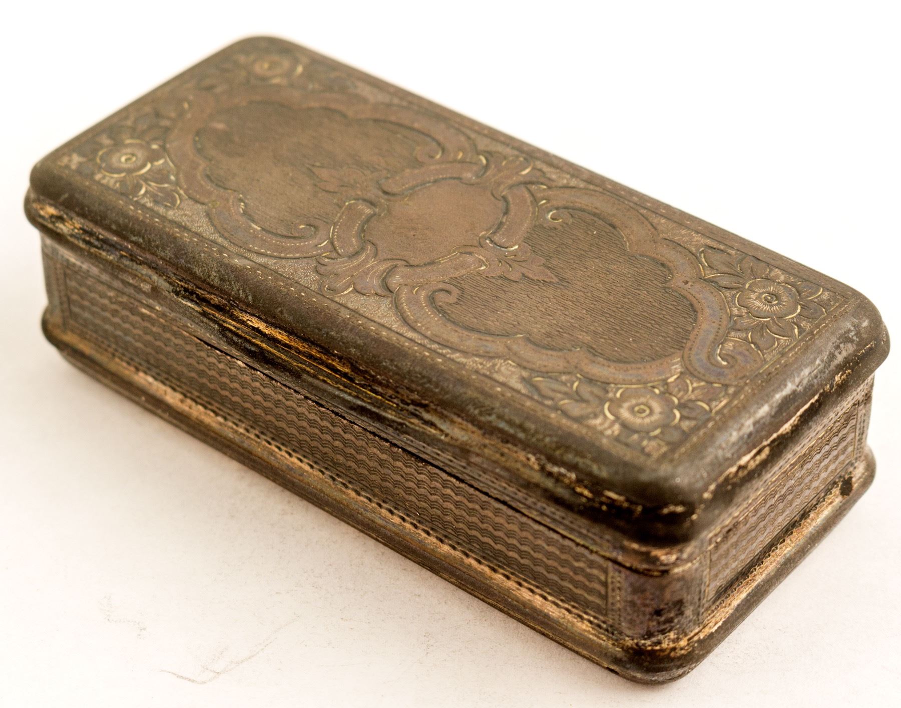 Hinged top metal box. 3 1/2 inches long, 1 3/4 inches deep, one inch tall. State: City: HWAC#: 48631 Date:
