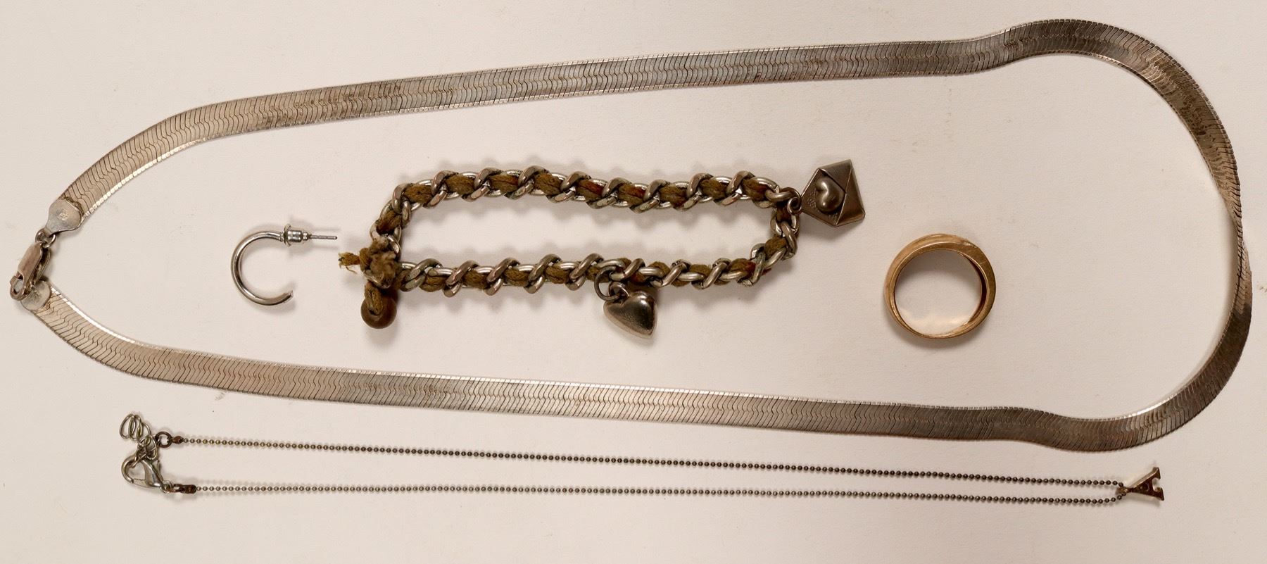 Item #1 of 5: I/2 pair of silver ear rings . Item # 2 of 5: Metal charm bracelet with heart n heart coming out of an envelope. Item # 3 of 5: 9" chain , with the letter " A" no embossing. Item # 4 of 5 : Maybe white gold, and is marked 925/ Italy/ HCT /925. Item # 5 of 5: Gold ring with stones, may be diamonds , marked 10k- AM-60 Houghton Estate Collection