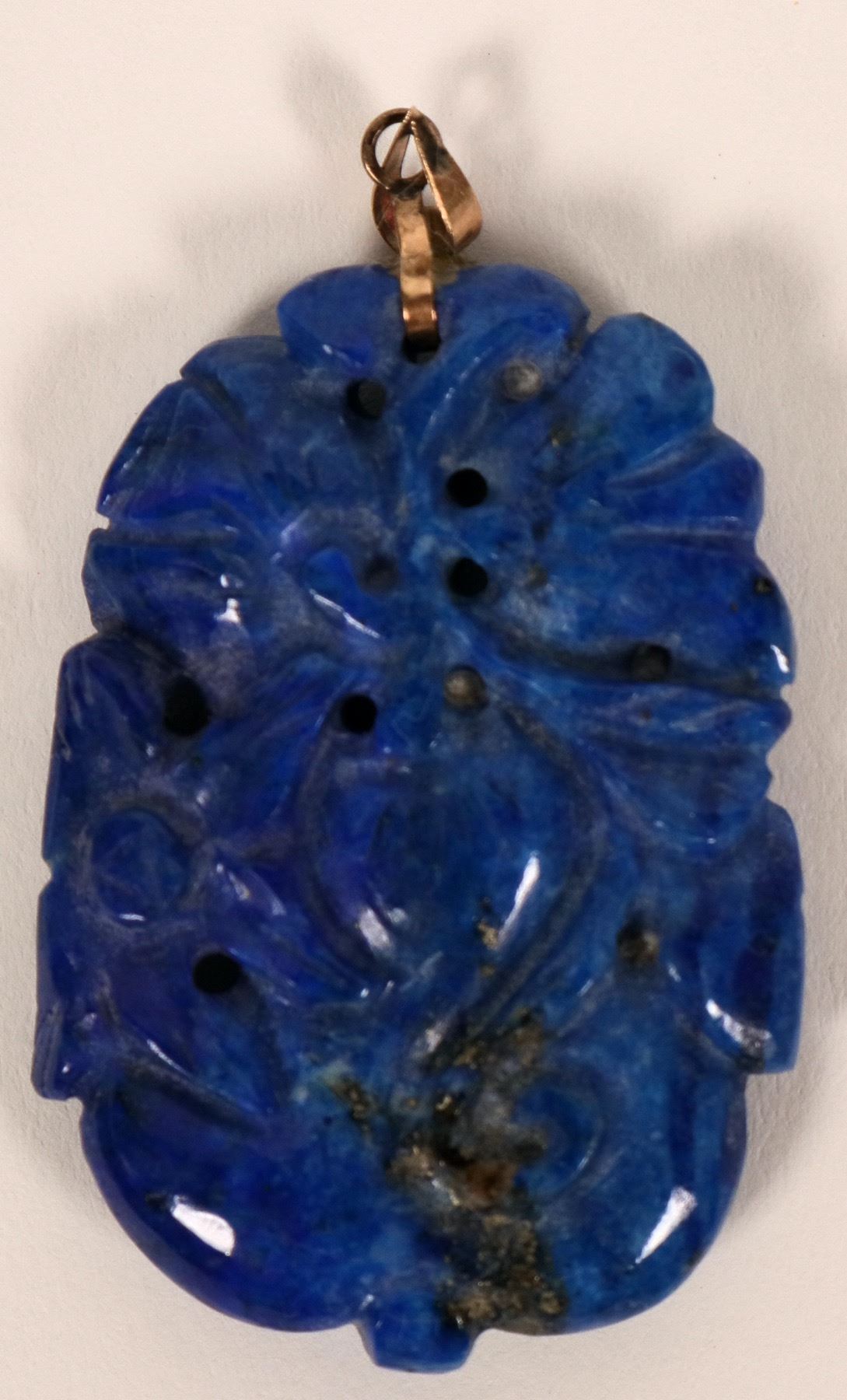 This antique lapis lazuli pendant is, in one word, stunning… exquisitely carved on both sides, rich solid blue, 1.5" x 1". Intricate floral design. 18k gold attached hanger.