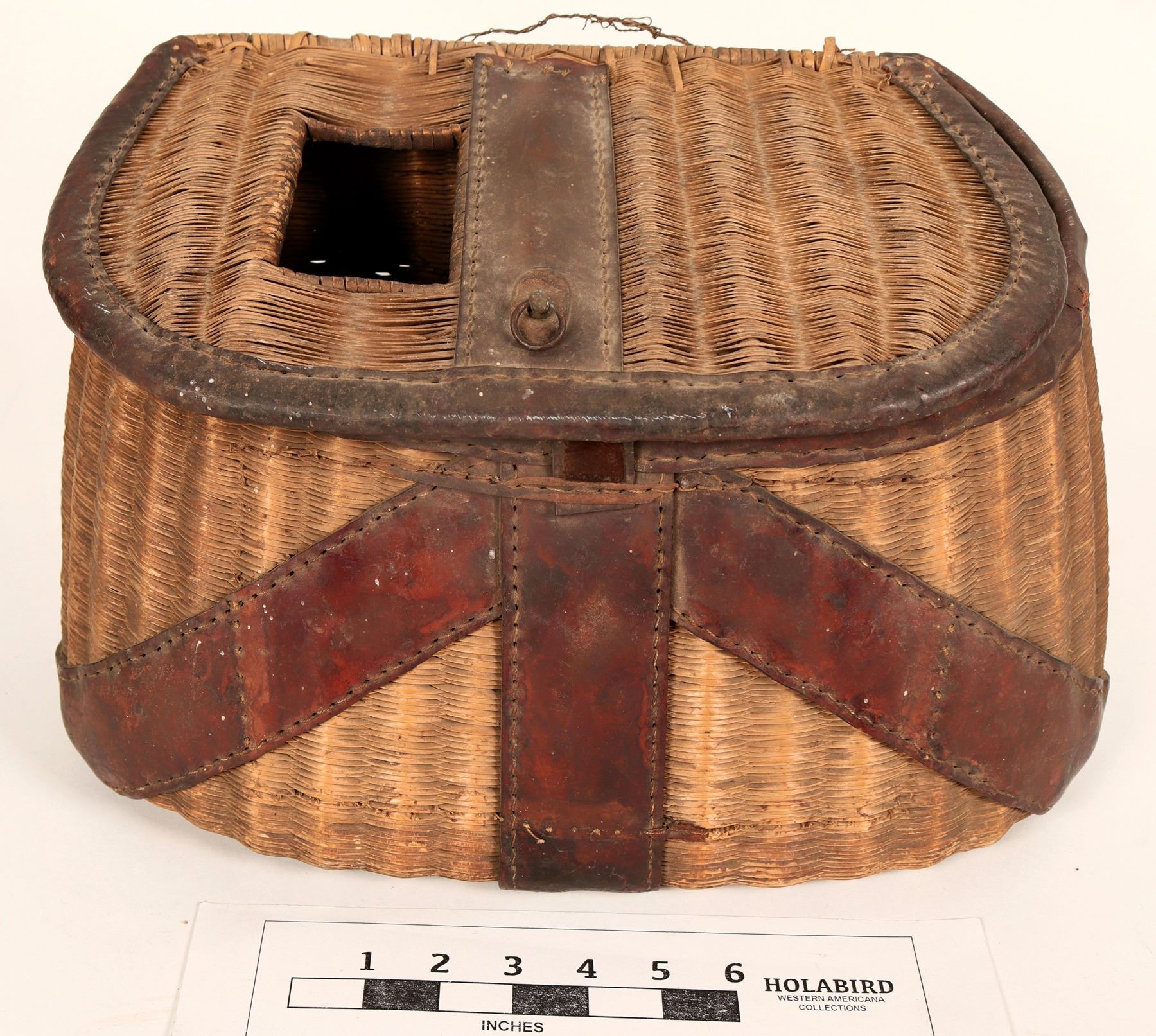Hinged wicker basket with leather reinforcements, approx 15 x 8 x 10 inches. In good condition but without handle straps. A thin copper wire has been added to the back of the hinge to hang it on the wall for display. See photos for condition and design details.