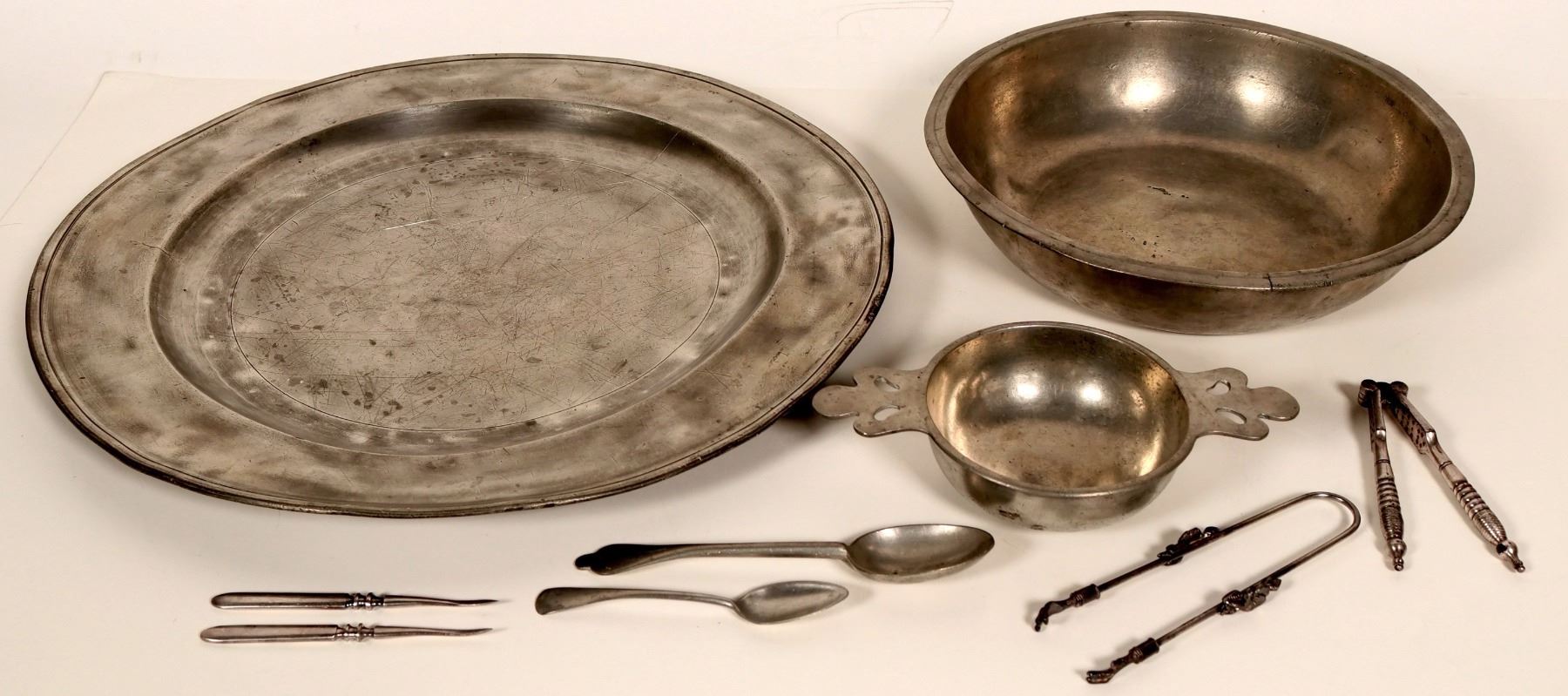 Amazing antique collection. 1) Very large London R M pewter round platter. 18" diameter. 2) London pewter two-handled porridge bowl--2"h x 5"d. Both pieces c.1800's. 3) Large pewter bowl, hallmarked, but not readable. 2.5"h x 11.5"d. Flat base. c. 1800's or earlier. Also included several pewter serving tools: Chicken claw tongs, nutcracker, two spoons. Also, two Rogers Bros. lobster or crab picks. Date: Country (if not USA): United Kingdom State: City: Provenance: