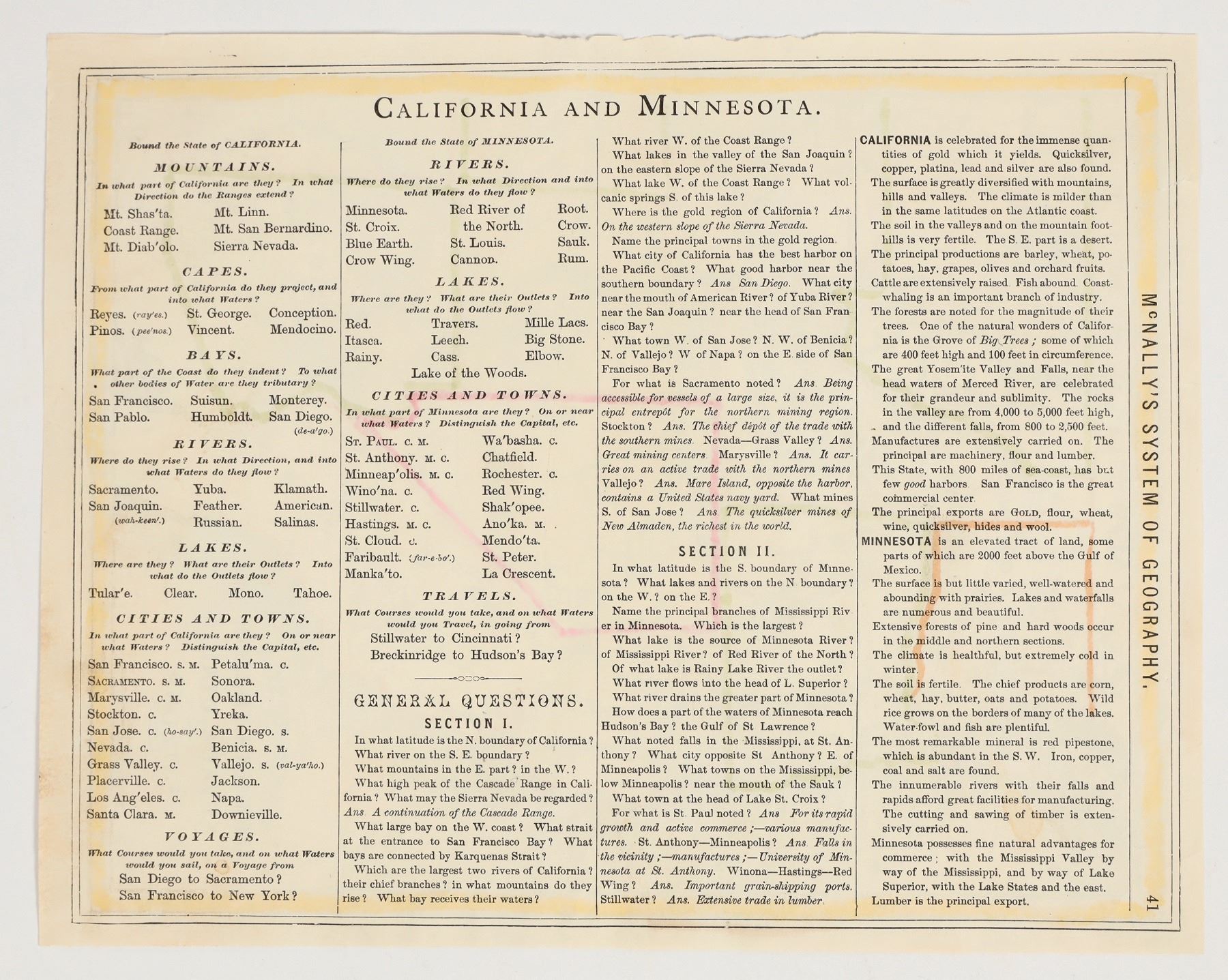 From McNally's "System of Geography", 1868. Shows details like for, towns, rivers, lakes, mountains, and the newly completed Transcontinental Railroad. Nevada: Comstock, Lake Tahoe, Aurora (no Bodie yet). 11.75 x 9" Reverse has printed text about California and Minnesota.
