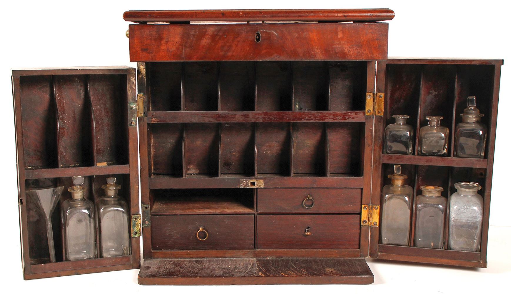 Antique wood medical cabinet for a doctor. Could be transportable for house calls. Needs some repair. Various drawers and cubbys for apothecary bottles, etc. Some bottles in cabinet. The cabinet belonged to a Philadelphia surgeon from the old Philadelphia Hospital. Great piece. HWAC# 57828 Date: Location: Philadelphia, Pennsylvania