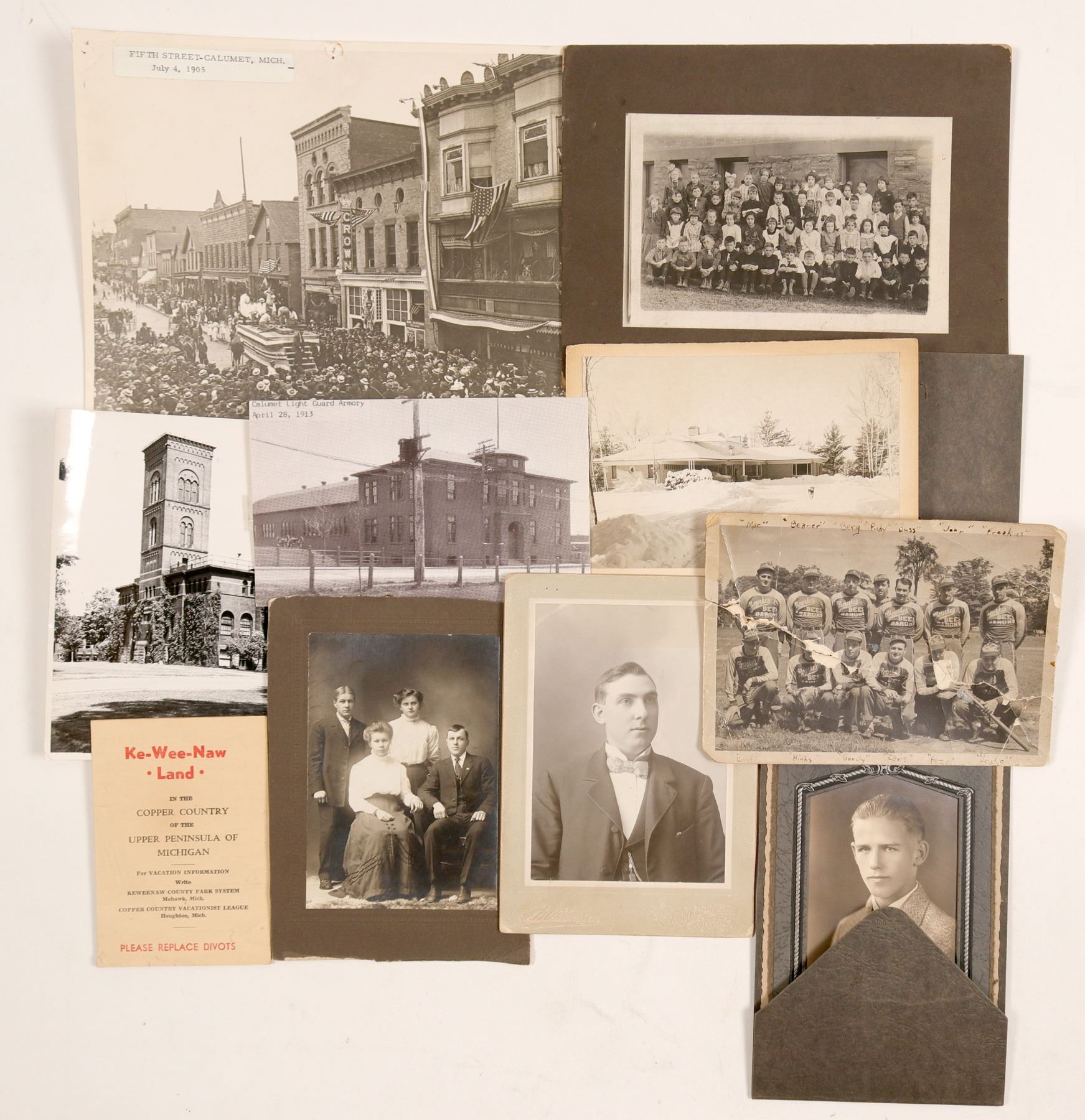 Lot of 8. 1) Photos. Seven pieces. All are from a large Michigan collection. Includes: 8 x 10" print of July 4th, 1905 parade in Calumet; 4.25 x 6.5" mounted photo of schoolchildren, unidentified; 5 x 7" 1940s picture of baseball team; 5 x 7" studio portrait from Archie Studio, Iron Mountain; another 5 x 7" Iron Mountain portrait; 5 x 7" mounted of family, unidentified; plus 3 others. 2) Keweenaw Golf Course scorecard. No date. Houghton Estate Collection