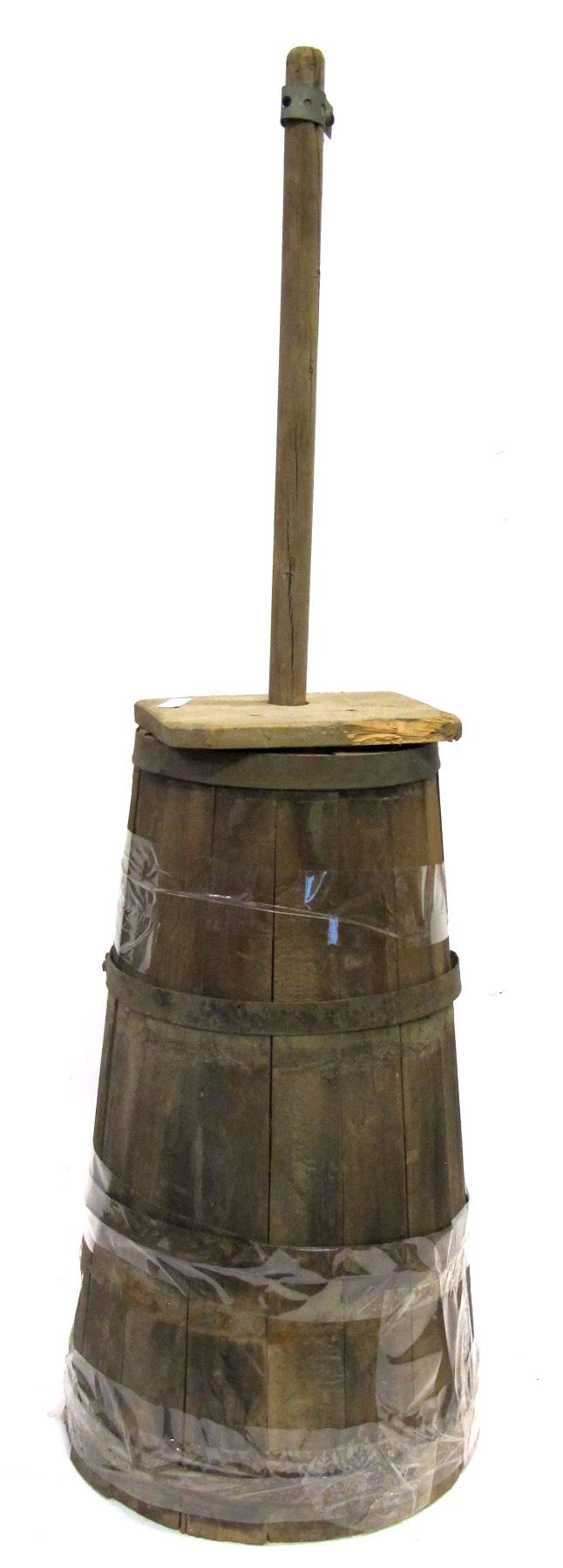 Wood milk churn from the Fresno area, circa 1911. 10" diameter at the base, 7" diameter at the top 19" tall plus press down churn. Made of individual wood staves. Good to very good condition. (Daniel Manassellian Collection) Date: City: Fresno State: California HWAC# 77832