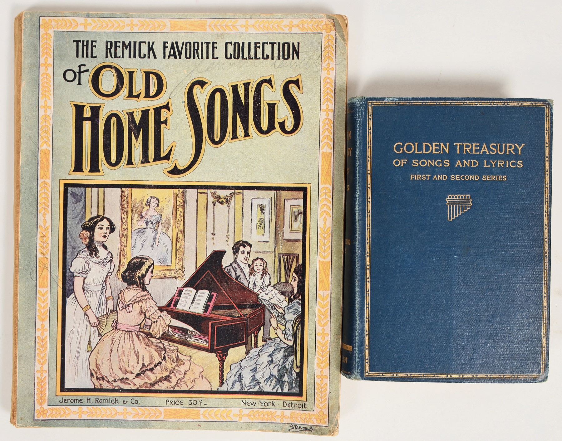A pair of antique music books, dated 1909 and 1911. Includes "The Remick Favorite Collection of Home Songs" by J.H. Remick & Co. (sheet music) and "Golden Treasury of Songs and Lyrics, First & Second Series" (lyric book). Decent condition, notable toning on pages and some cosmetic wear/staining to covers; see photos.