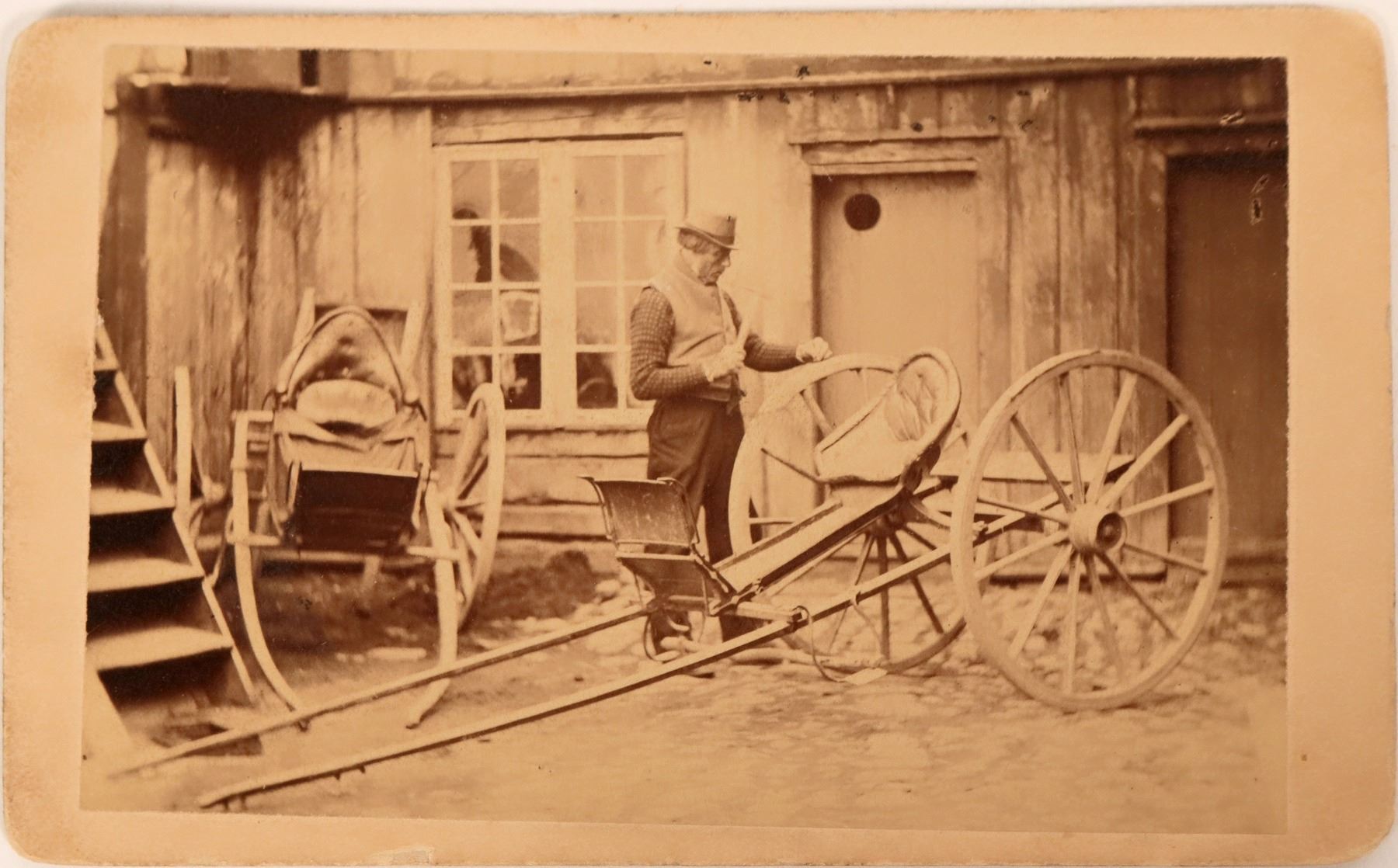 Small black/white photo; circa 1865-70; Man making a horse buggy , back of photo stamped Petra Sanling & Co. Fotogrfisk Atelier Throndm, penciled name Ingebret Detli