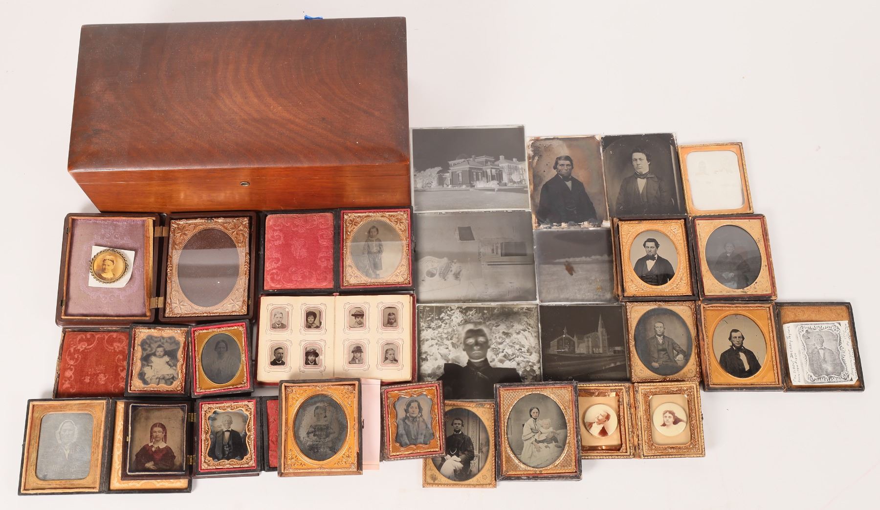 Assortment of antiques photos, mostly from W & P Nicholls of Dutch Flat, CA, a family of bankers, c. 1862-1910. Includes 4 daguerreotypes in full or partial cases. 1 repeated as Zachary Taylor, which we cannot verify as sometimes high quality photographs can be difficult to differentiate. 7 ambrotypes? in partial cases. 4 tintypes in partial cases. 3 celluloid breast pins, unidentified, c. 1870's. 8 glass negatives or ambrotypes, mostly unidentified portraits from the Grass Valley area. Also a large daguerreotype case and small tin type albums. Dutch Flat California. PHOTOGRAPH COLLECTORS! WE HAVE CDVS, DAGUERREOTYPES AND OTHER ANTIQUES PHOTOGRAPHS, MANY OF FAMOUS PLACES AND NAMES (LIKE BIG NOSED KATE, DOC HOLLIDAY'S LADY FRIEND) SCATTERED THROUGHOUT THIS SALE!