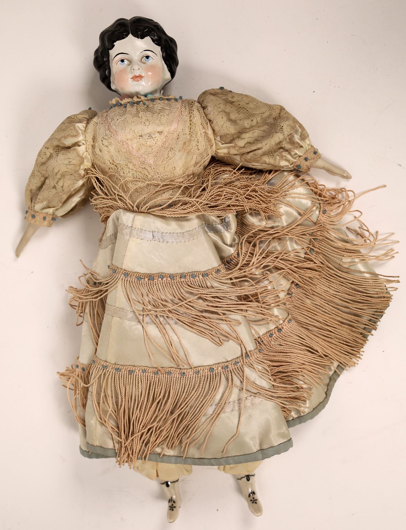 This antique doll is 18 in. tall with porcelain head-shoulders, bisque hands and legs. No visible makings. Believed to be in the style of 1895-1930's. She has a painted face, glazed rosy cheeks, painted eyes, eyebrows and dark hair. The head does not swivel. The dress may no longer be original with a lace-top sewn together, the skirt is hand sewn with fringe and cloth beaded trim. Pantaloons are included, the shoes are painted over bisque. Condition is very good. Dress shows age.