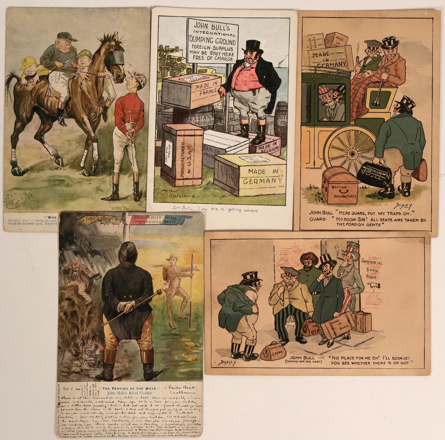 Old postcards from England. Published by C. W. Faulkner & Co. England, e.G. Series No.248E: John Bull's International Dumping Ground foegin Surplus may be shot here free of charge, image of man in topcoat standing on imports from France, Germany, Denmark, Belgium and USA. Chipboard - equestrian rider with blind horse and jockeys falling off"Who is Going to Ride it"Jockey Joe on Radical Parsy and says: Hello old pals! Which of you's going to ride the old 'oss" Mind you don't break the bloomin back. Entered for the next General Election Stakes is he? Poor beggar." another "The Parting of the Ways" John Bull's Rival Guides , image of backside of man in topcoat staring of directional french flag sign of tariffs pointing to Prosperity Path and tattered english sign And "free trade hills" John Bull "Here guard, put my traps on." Guard: "no Room Sir! all seats are taken by the foreign gents" British businessman trying to get on carraige with imports from Germany. another card: Dudley, John Bull (taking off his coat" "No place for me eh! I'll soon let you see whether there is or not" with bag of English good and stereotyped businessmen figures Uncle Sam, Abe Lincoln, Italian, Aghanistani satirical figures holding briefcases outside of the commercial show room