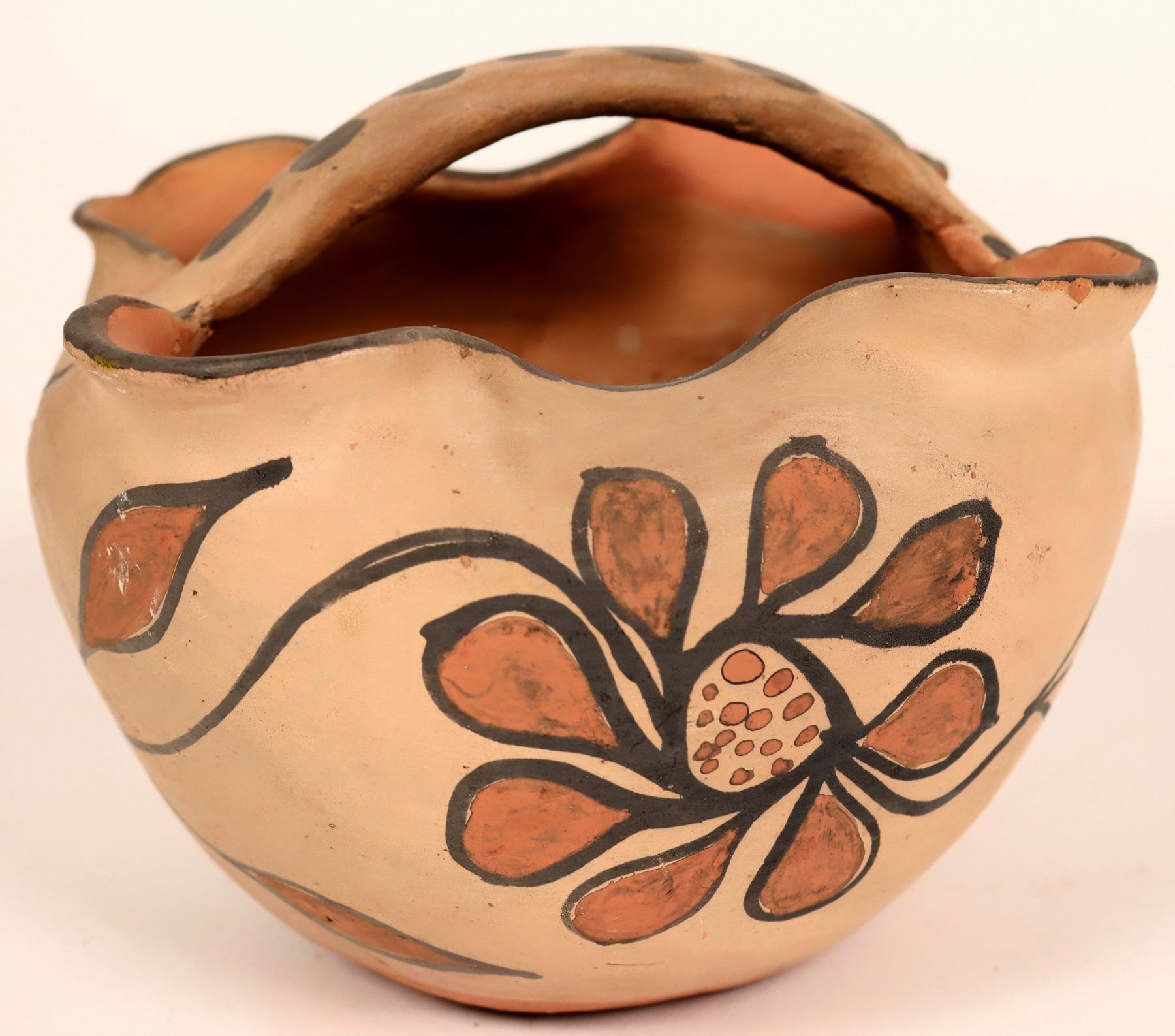 Great old pottery basket, very good condition for age. Traditional floral design. 6" fluted diameter x 5"high.