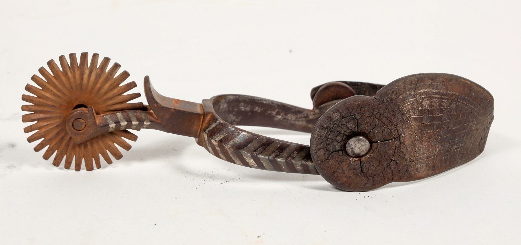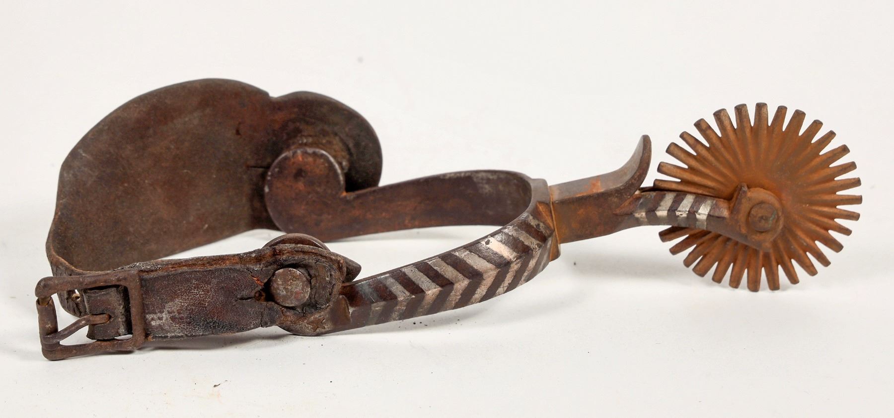 Single silver inlaid spur and straps, found on an Ogallala Nebraska ranch in 1920. Believed to have been left from the famous cattle drive trail from Texas up to Nebraska, which started is 1874 and ran through 1884. This beautiful spur and rowel are in excellent condition, even the tooled leather strap is in good shape, although age-hardened. The spur still jingles. A 2002 newspaper clipping is included that details the history and extents of the cattle drives. Truly a western historical piece, please see photos.