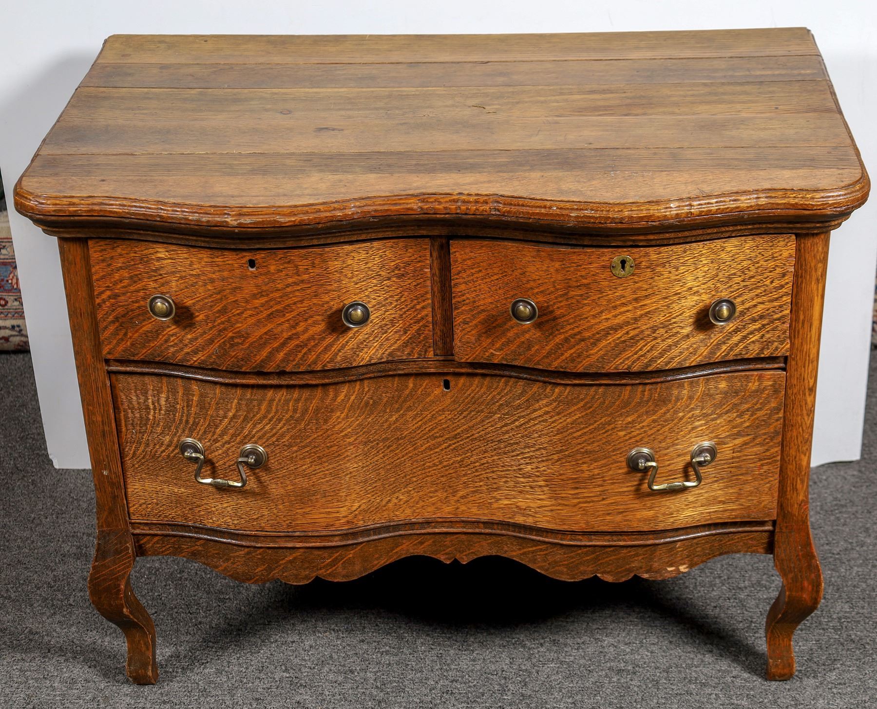 American Oak Dresser, no makers' marks or numbers. Original hardware has been replaced with brass knobs and pulls. Four drawers - double drawer on top and 2 full drawers. Tongue in groove construction, refinished, tiger's oak. Very good to fine condition.