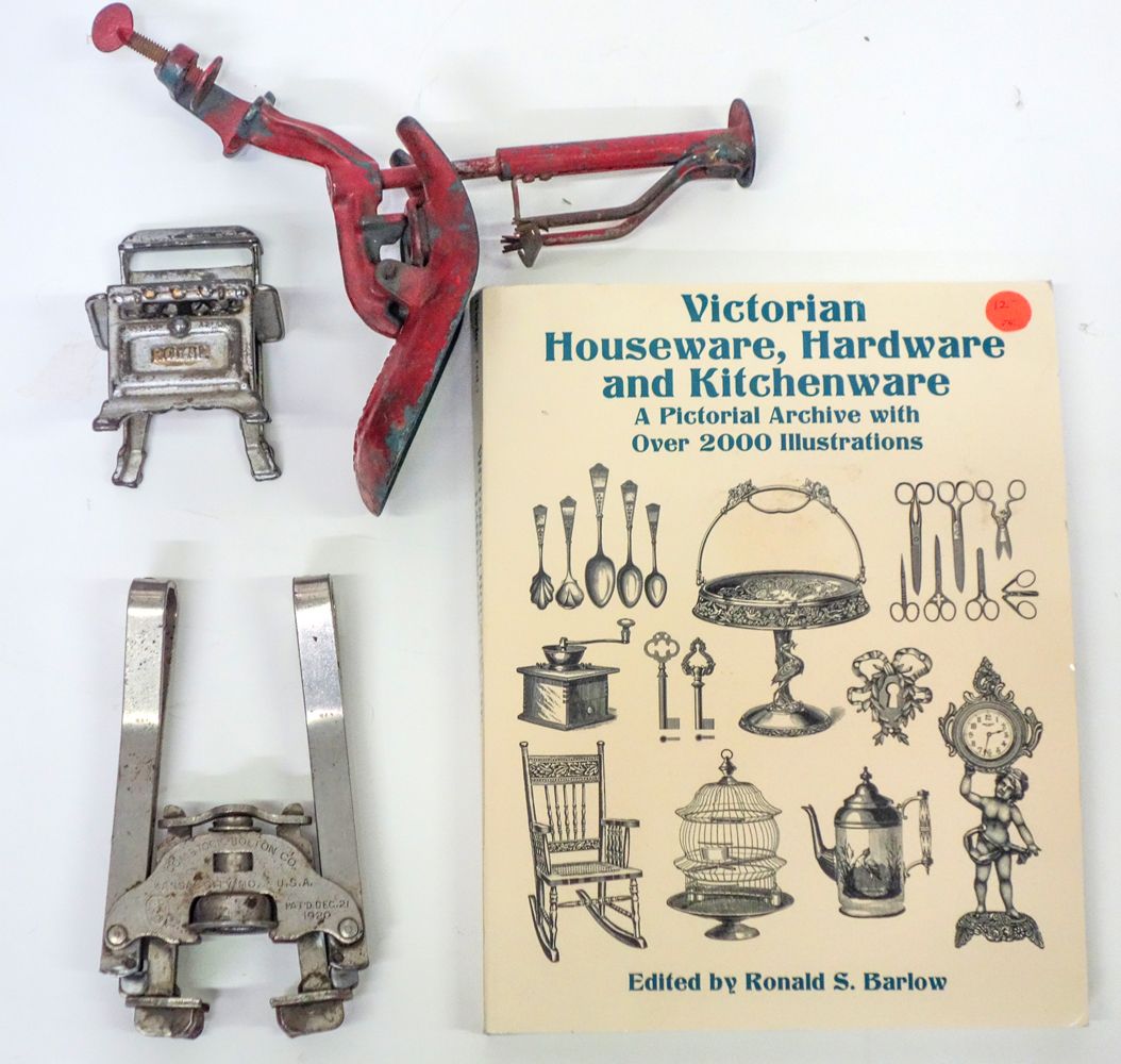 Three old pieces: 1. Hand crown cap bottle cap sealer by Comstock Bolton Co., 1920.; 2. Antique cherry pitter "Nome Cherrystones", 1920. 3. Toy cast iron stove, c 1900. All fine. Includes reference book.