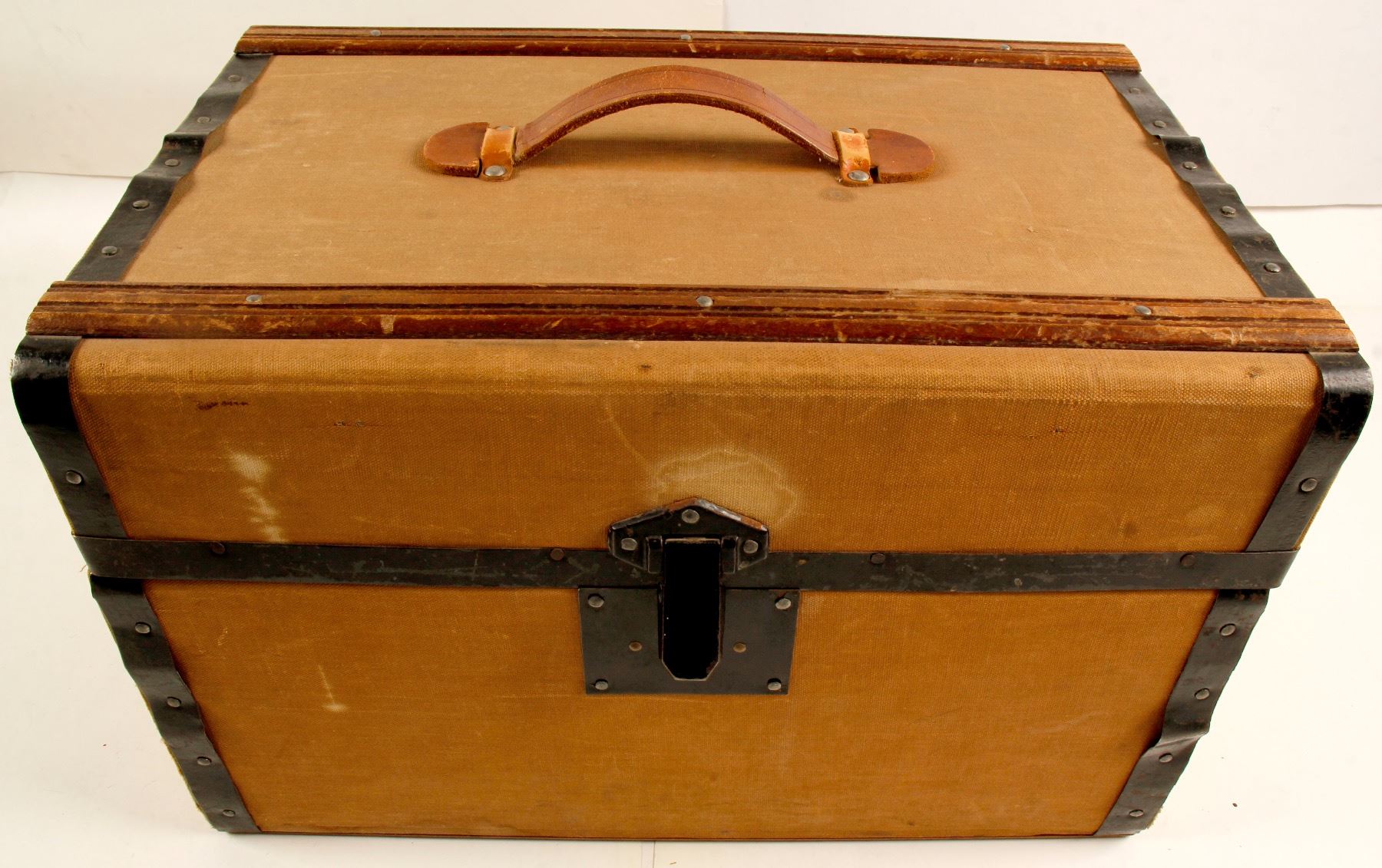 Wood & canvas trunk inscribed on the side for W.E. Owens, Virginia City, Nev. Masonic imagery (shield and sword). MC Pettibone Manufacturing Co Uniforms. 18" x 11" x 12" William E. Owens was born about 1848 in Wales and came to Virginia City with his brother Owen at some point in the 1870s. They are not listed in the 1868 or 1873 Virginia City directories. They worked as miners. William died October 4th, 1895 from a heart condition. His brother Owen had died the year before. Both are buried in the same plot in the Silver Terrace cemetery in Virginia City. According to Sacramento Daily Union (October 13, 1879), Owen Owens was injured in a mine accident at the Julia Mine: "By an unexpected lowering of the slide in the Julia mine today, on which a air-pipe was being taken into the mine, Abe Geary had his thigh badly crushed and John Peters and Owen Owens were thrown into the hot water and scalded about their legs. They will probably all recover." According to Sept. 9, 1885 Virginia Evening Chronicle, W.E. Owens was one of the Virginia & Truckee Railroad departures for that day (along with noted jeweler M.M. Fredrick). Perhaps he took this trunk on that journey! Masonic trunks like this would hold all of the regalia and fraternal uniform items. Trunk does show signs of use (scuffs, stains). A great Nevada piece! Date: c. 1890's City: Virginia City State: Nevada HWAC# 77854