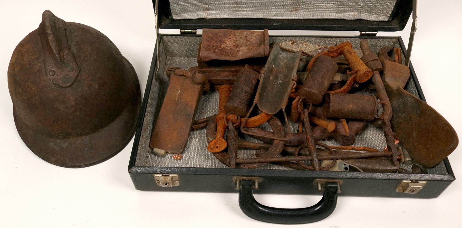 Antique vintage miscellaneous metal detecting rusty finds and a WWI French military helmet.
