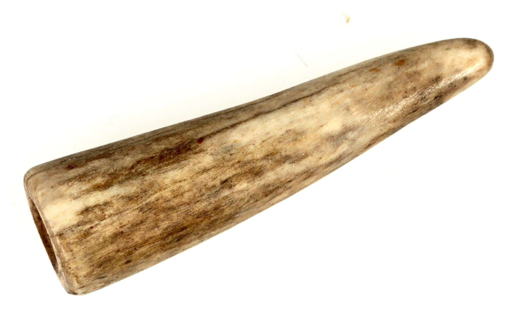 This is an arrow tip made Whitetail deer antler. Found at a site in the southeast US. Interestingly, the tip has been drilled, but not with a modern bit; it tapers. Please see photo for details. At 2 in. in length.