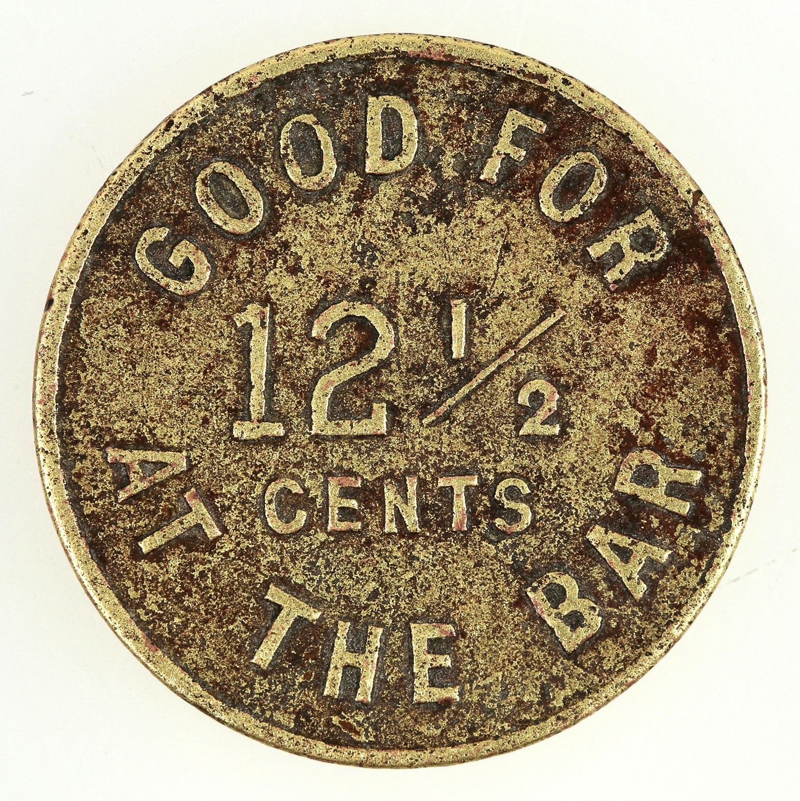 Rare Arizona Territory! Spooner PRE-025; R-9. THE ANTLERS / PRESCOTT / A.T. / L.A. RUB. STAMP CO. // GOOD FOR / 12Ω / CENTS / AT THE BAR; Br., rd., 21 mm. Very fine condition.