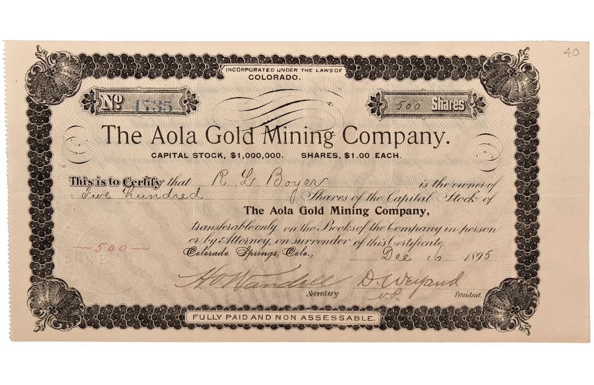 Number 1735 issued to R. L. Boyer by H. V. Wandell as Secretary and D. Weyand as Vice President and President on 16 December for 500 shares. This stock is smaller in size than the usual stock. U/C. Excellent condition. Rare. The co Date 1895 Cripple Creek, CO hwac 10021