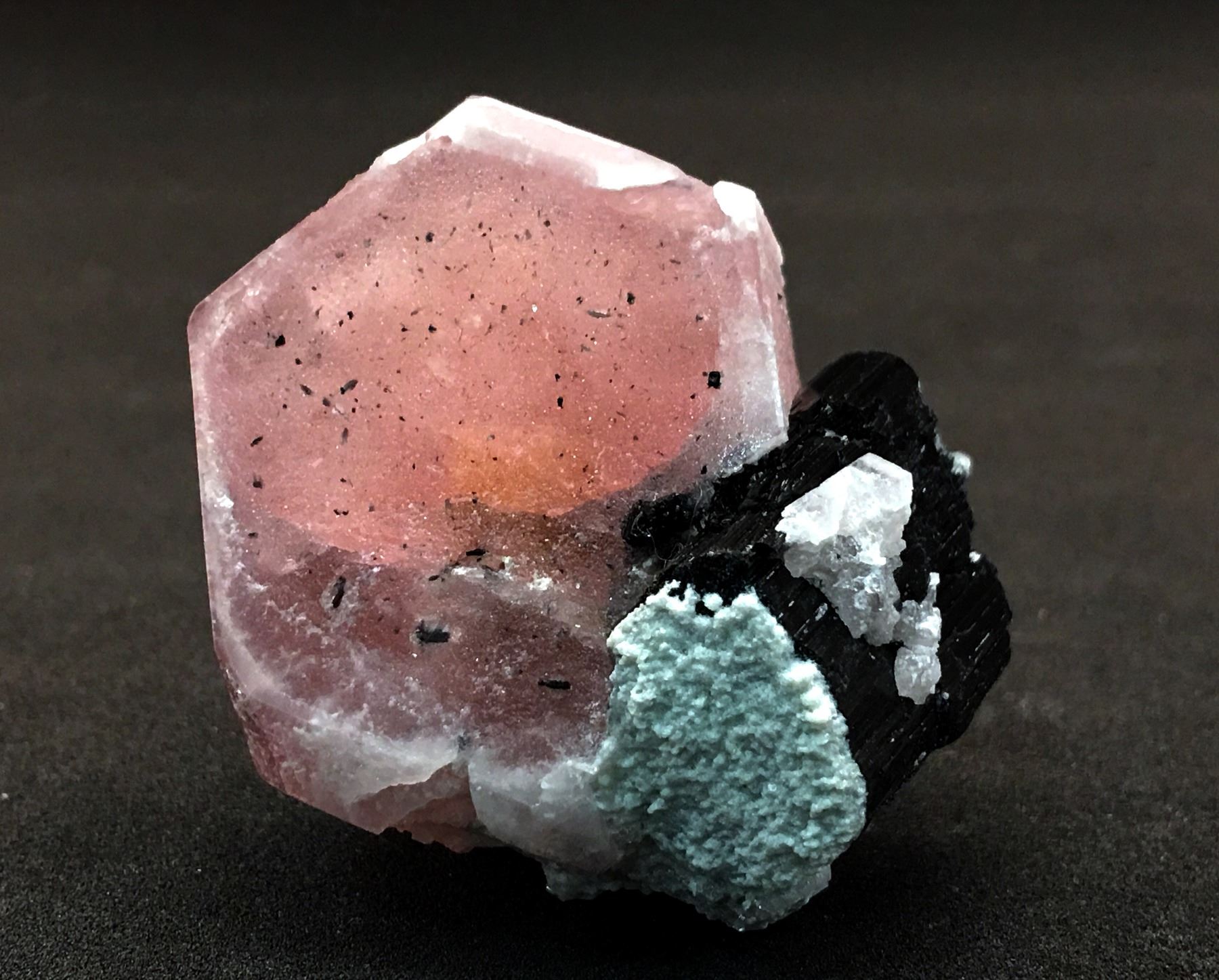 This specimen was recovered from one of the numerous, complex granitic pegmatites in the area of Bulochi, Pakistan. Bulochi is a small village 4 kilometers south of the Indus River. The specimen features a 2" tall, tabular, hexagonal crystal of pink apatite associated with schorl (black tourmaline) and minor albite feldspar. Pink is a highly prized color for apatite, the specimen has superb aesthetics, and the specimen is in excellent condition. Dimensions (cm): 5 H x 4.2 W x 3.4 D. Location: Bulochi, Astor valley, Astor District, Gilgit-Baltistan, Pakistan City: State: Pakistan Date: