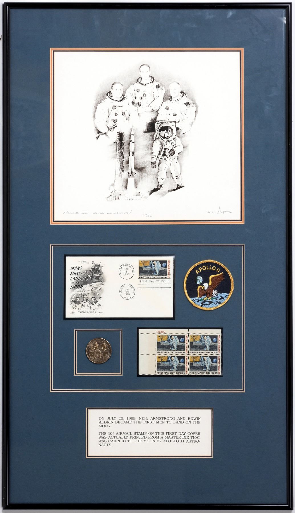 Fabulous framed Apollo 11 group. Print by Witkoff 270/300, 9.5x11". Cacheted First Day Cover. Mission patch, medal, Airmail plate block. The airmail stamp on the cover was printed from a master die that was carried to the moon with the astronauts. Frame 30x17".