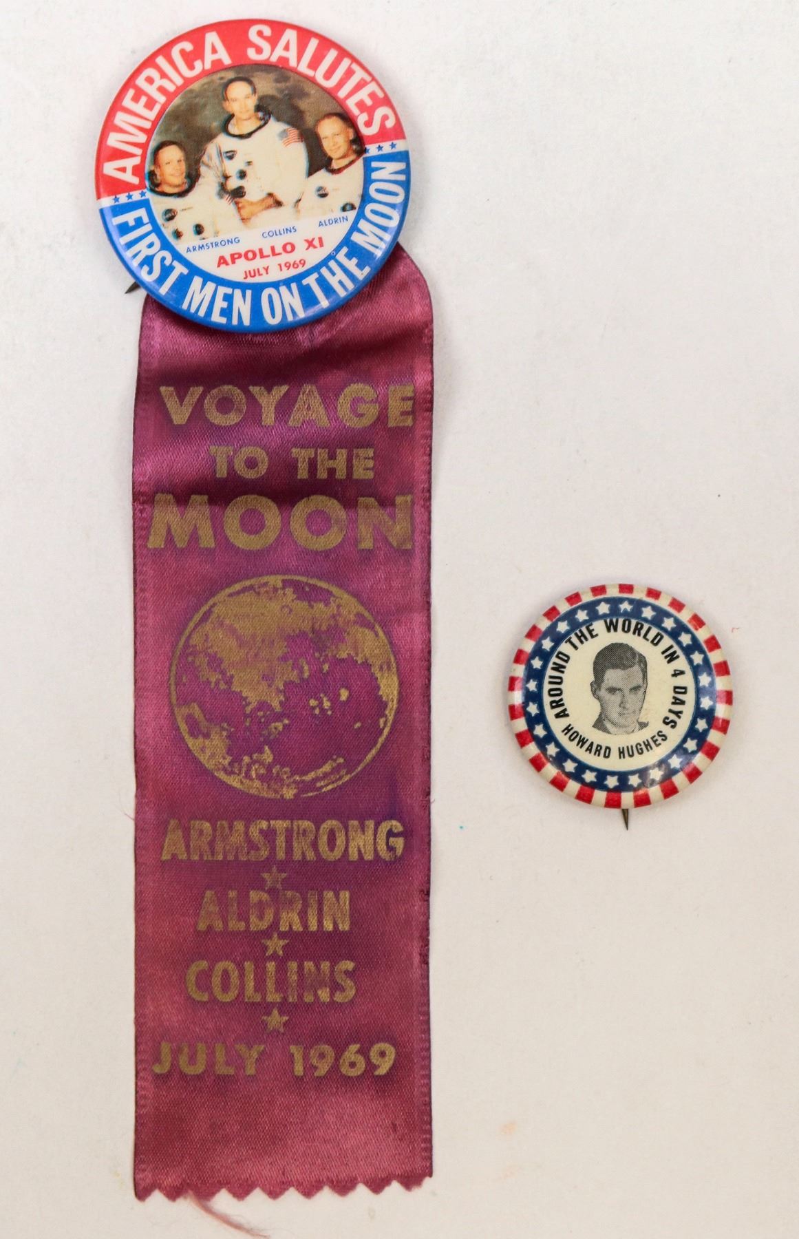 Two aviation related pinbacks: 1) Around the World in 4 Days / Howard Hughes (32 mm); 2) America Salutes First Men on the Moon Apollo XI July 1969 (45 mm with ribbon: voyage to the moon Armstrong Aldrin Collins July 1969).