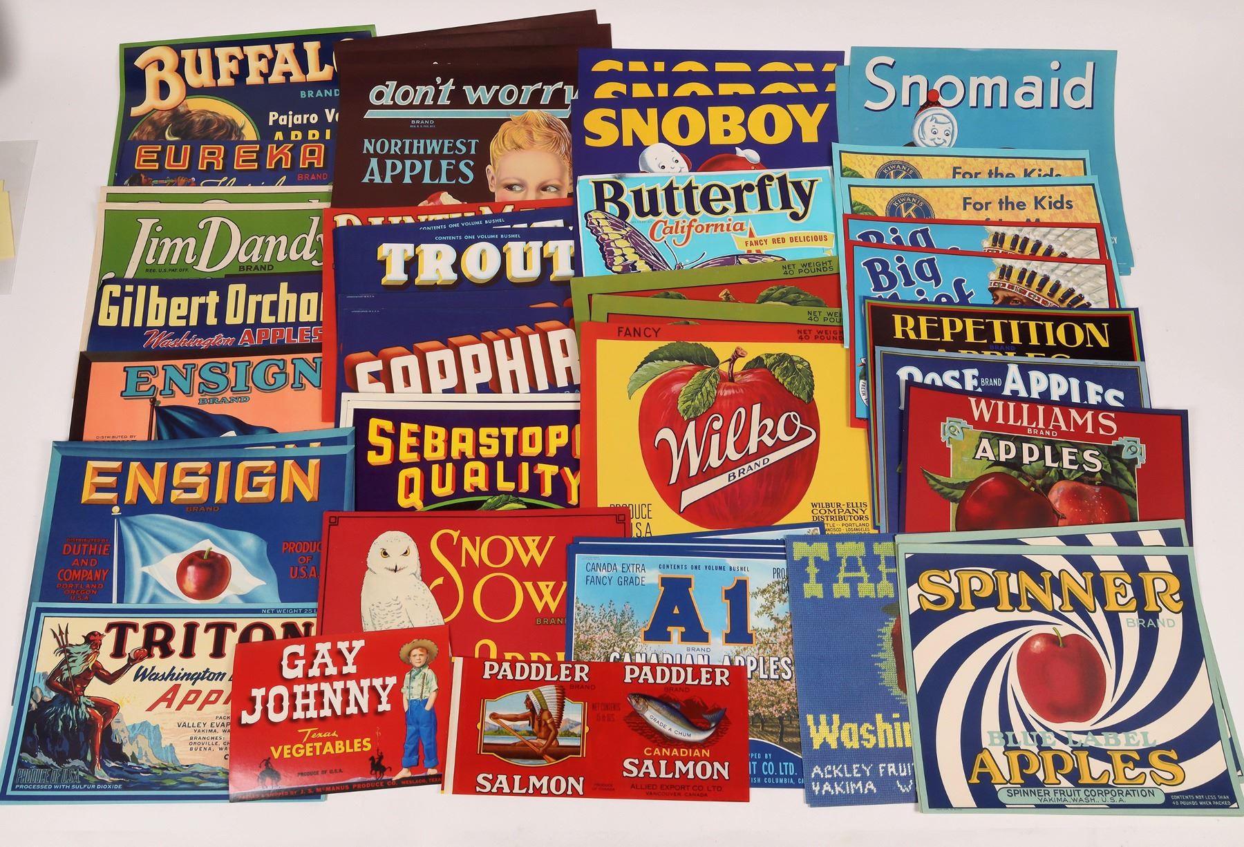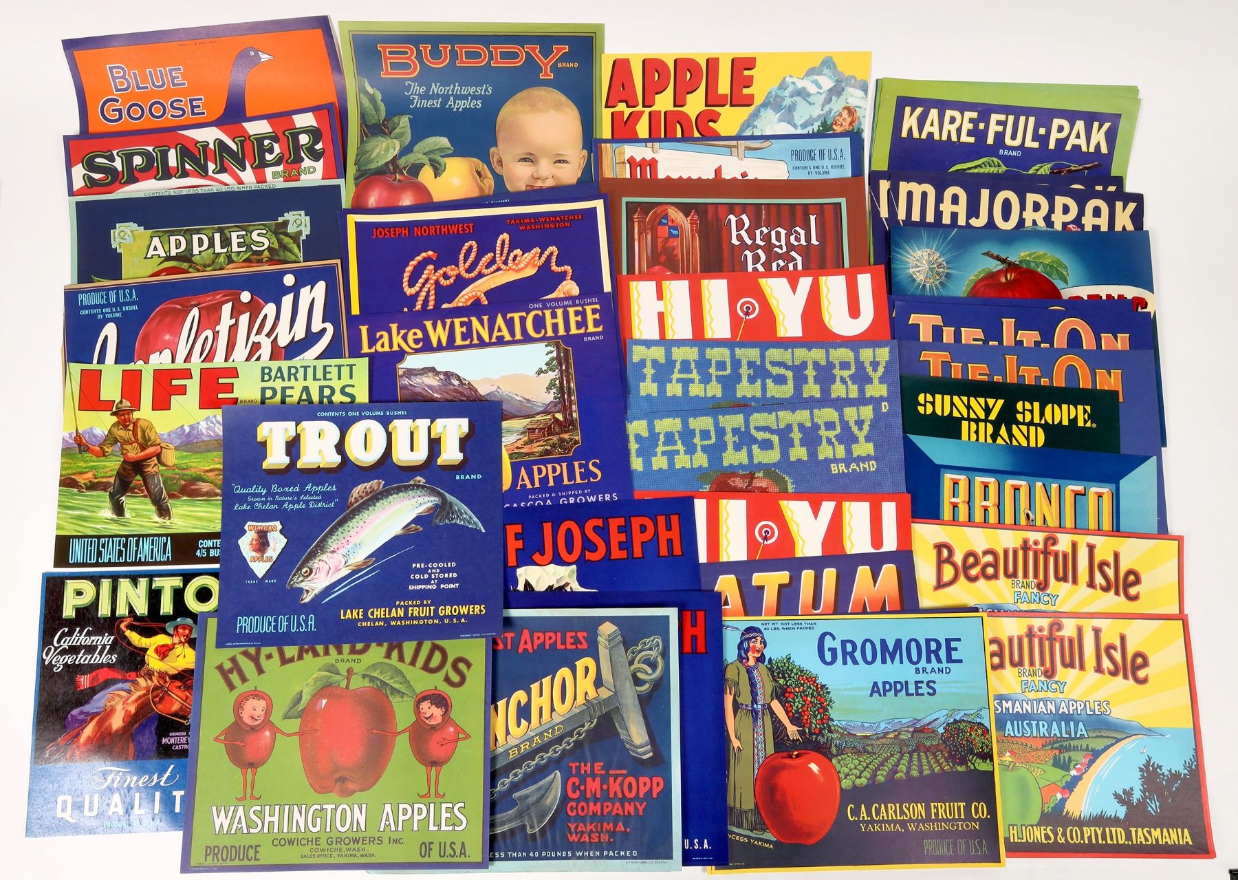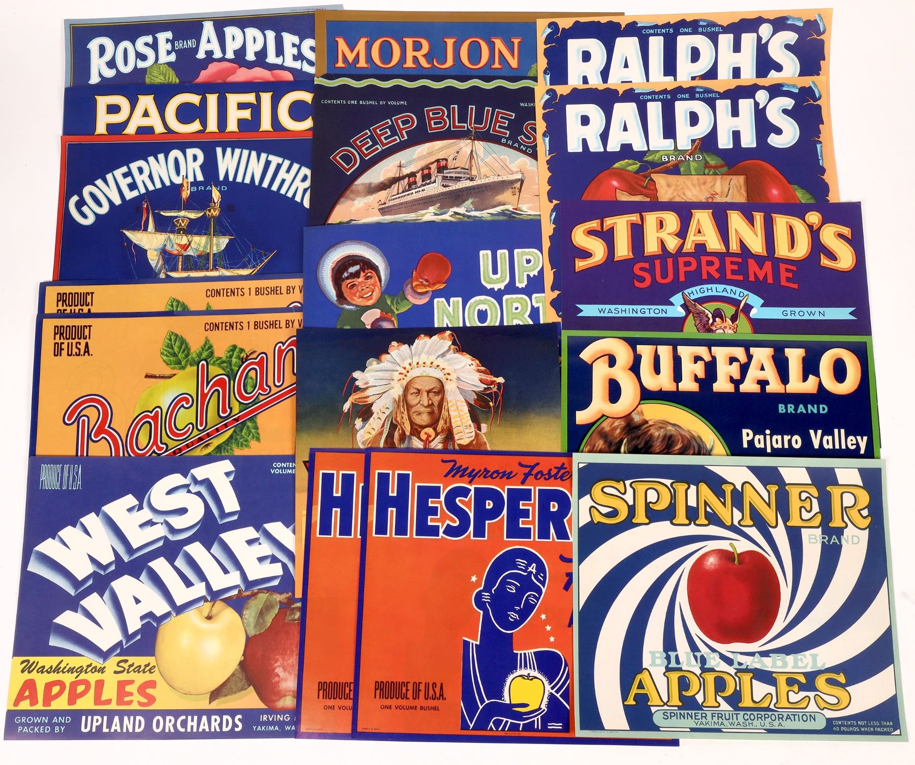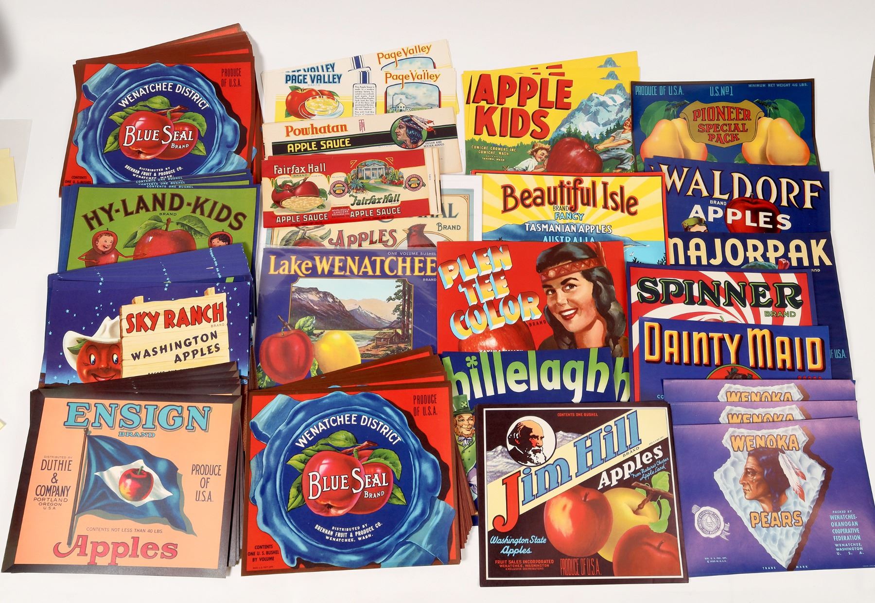About 400 assorted apple crate labels, mostly from California and Washington. Blue Seal, Donner, Buffalo, Ralph's, Hesperian, Sky Ranch and many more.
